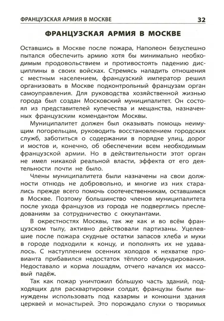 Книга небольшая ( всего 63 страницы), но очень информативная. В кратком изложении представлены все этапы войны,что помогает понять всю картину. В конце есть 2 справочника : герои и полководцы войны 1812 года года.Кроме того, на 4 страницах представлены репродукции картин с полководцами и событиями того времени.