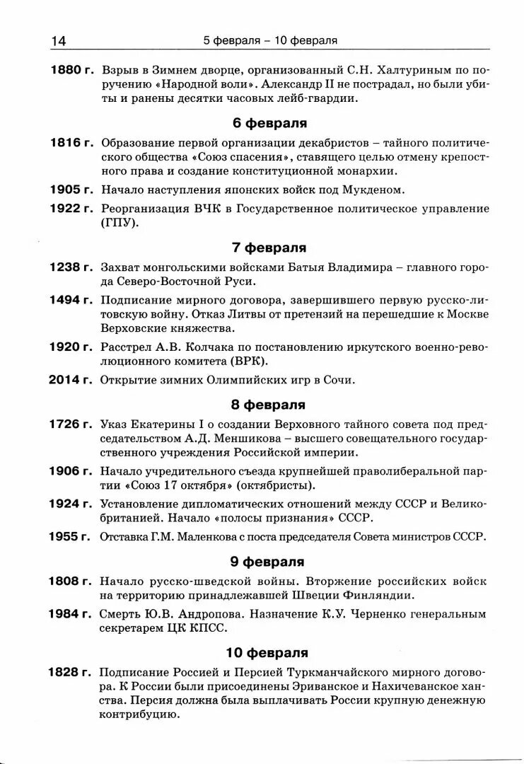 Каждый месяц начинается с блока "точная дата не известна". Даны основные даты. Единственный минус - даты до 31 января 1918 г. даны по старому стилю без указания второй даты в скобках, как это принято. Первое, что попалось на глаза - восстание декабристов в календаре отнесено к 14 декабря. В целом, неплохое издание для всех интересующихся историей.