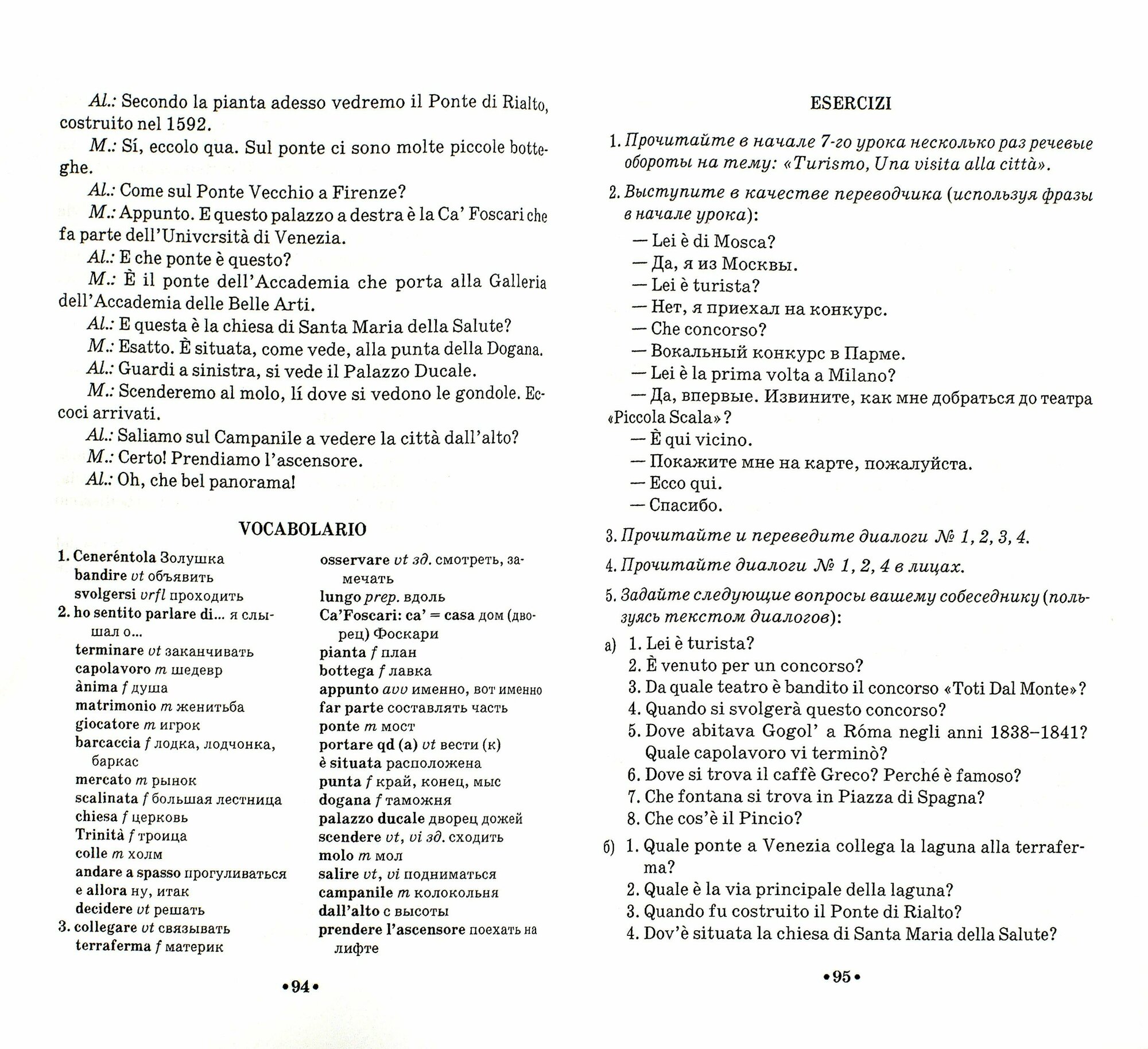 Рекомендовано к изданию Министерством общего и профессионального образования Российской Федерации в качестве учебного пособия для студентов высших учебных заведений, обучающихся по направлению "Искусство" и группе специальностей "Культура и искусство". Пособие в доступной и увлекательной форме знакомит читателя с наиболее употребляемыми образцами современного итальянского языка в его разговорном и письменном варианте. Цель пособия - научить говорить по-итальянски в пределах пройденной тематики. Для осуществления этой цели пособие содержит короткие рассказы, диалоги, шутки, речевой этикет по следующим темам: "Быт", "Театр", "Музыкальная жизнь", "Живопись", а также дополнительные тексты для чтения и пересказа. Каждый урок пособия содержит итальянско-русский тематический словарь и сопровождается поэтическим текстом. Предназначается для студентов вузов искусств, музыкальных училищ, а также может быть полезным в деловой или туристической поездке по Италии.