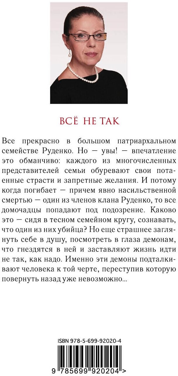 Все прекрасно в большом патриархальном семействе Руденко. Но - увы! - впечатление это обманчиво: каждого из многочисленных представителей семьи обуревают свои потаенные страсти и запретные желания. И потому, когда погибает - причем явно насильственной смертью - один из членов клана Руденко, то все домочадцы попадают под подозрение. Каково это - сидя в тесном семейном кругу, сознавать, что один из них убийца? Но еще страшнее заглянуть себе в душу, посмотреть в глаза демонам, что гнездятся в ней и заставляют жизнь идти не так, как надо. Именно эти демоны подталкивают человека к той черте, переступив которую повернуть назад уже невозможно…