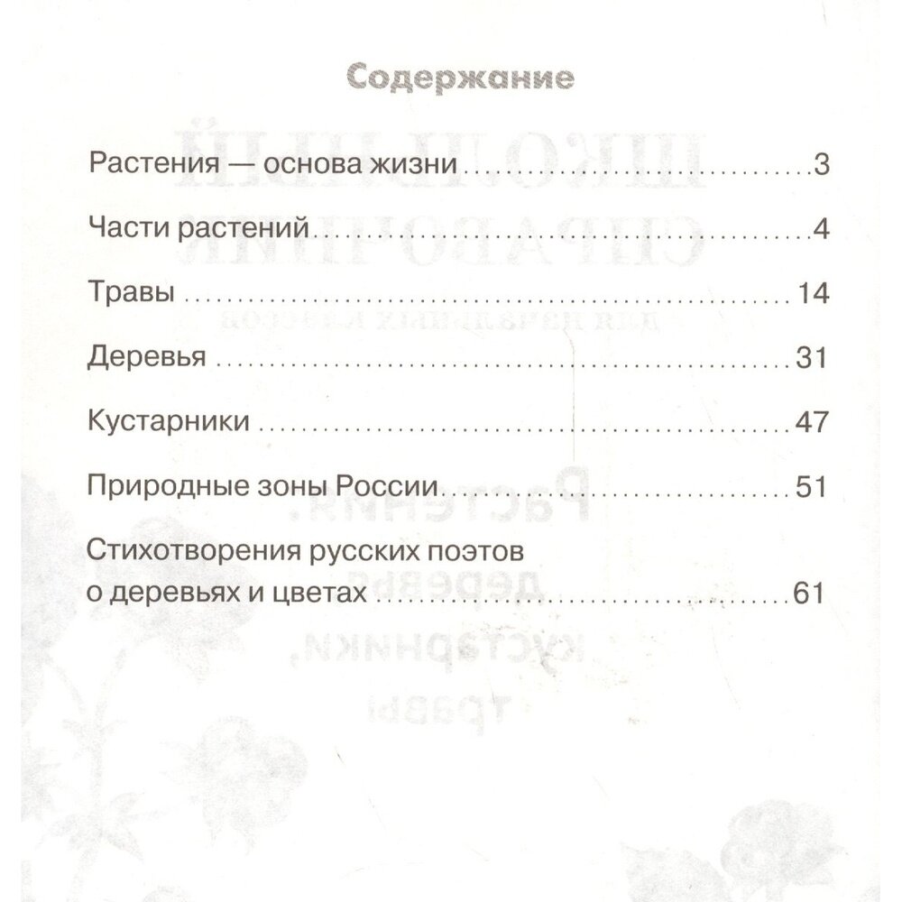 В целом справочник мне понравился. Цветные иллюстрации находятся в центре книги, остальные черно-белые. В конце книги несколько стихотворений русских поэтов. Справочник подходит не только для начальной школы, но и детям 6-7 лет для первого ознакомления с растениями. Для такой цены вполне хорошая книга.