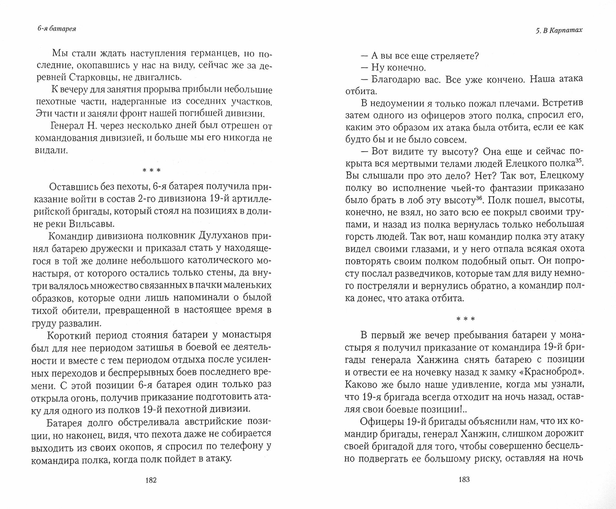 В своих воспоминаниях Б. В. Веверн, полковник русской армии, непосредственный участник Первой мировой войны, рассказывает о формировании и боевом пути 6-й батареи в составе 81-й артиллерийской бригады. Батарея впервые участвовала в боях на Висле в кампании 1914 года, затем в осаде австро-венгерского Перемышля, совершила бросок через Карпаты, а летом 1915 года прикрывала отход других частей из Брест-Литовска. Живым языком автор описывает сражения, военный быт, трудности и радости походной жизни солдат и офицеров. Эта книга - сложный и многогранный взгляд на военные события того времени и на судьбу отдельных людей на войне.