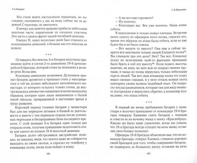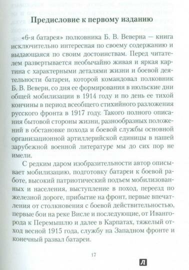 С большим интересом прочитал книгу воспоминаний полковника Б.В.Веверна.Автор начинает рассказ с момента развертывания резервной артиллерийской батареи.Подробно описывает связанные с этим хозяйственные и мобилизационные мероприятия .Книга позволяет окунуться в атмосферу боевых будней артиллерийской батареи и ее пехотных "соседей".