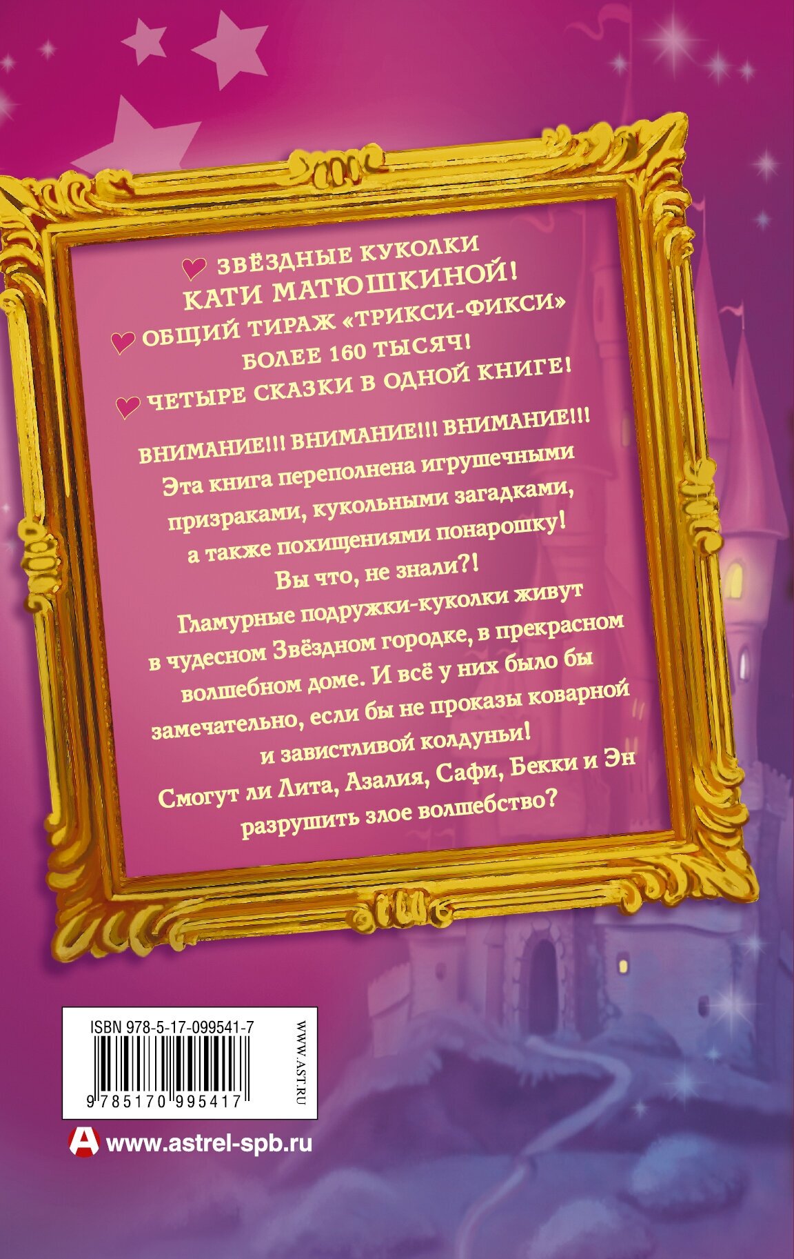 ВНИМАНИЕ!!! ВНИМАНИЕ!!! ВНИМАНИЕ!!!Эта книга переполнена игрушечными призраками, кукольными загадками, а также похищениями понарошку!Вы что, не знали?!Гламурные подружки-куколки живут в чудесном Звёздном городе, в прекрасном волшебном доме. И все у них было бы замечательно, если бы не проказы коварной и завистливой колдуньи!Смогут ли Лита, Азалия, Сафи, Бекки и Эн разрушить злое волшебство?