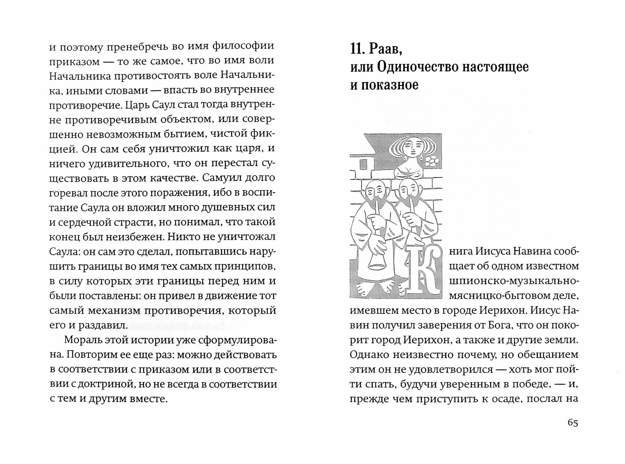 Автор берет сюжеты из Библии и на их основе делает небольшие парадоксальные рассказы-размышления. Я бы даже назвал их упражнениями в логике - почти каждый сюжет рассмотрен с точки зрения двух персонажей и эти точки зрения противоположны. Каждый рассказ завершается авторской моралью, и часто это третья точка зрения.