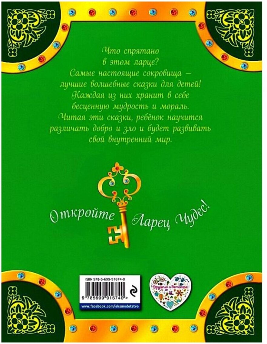 Что спрятано в этом ларце? Самые настоящие сокровища - лучшие волшебные сказки для детей! Каждая из них хранит в себе бесценную мудрость и мораль. Читая эти сказки, ребёнок научится различать добро и зло и будет развивать свой внутренний мир. Откройте ларец чудес!