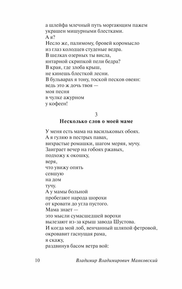 В этот сборник вошли наиболее известные поэмы и стихотворения Маяковского разных лет, в полной мере представляющие читателю уникальный стиль поэта: "Флейта-позвоночник", "Облако в штанах", "Про это", "А вы могли бы?", "Любовь", "Во весь голос", стихи из "американского" цикла и др. Оригинальность, бунтарство, резкость стихотворных строк и невероятная, берущая за душу эмоциональность Маяковского, поражавшие его современников, и сейчас не оставят читателя равнодушным.