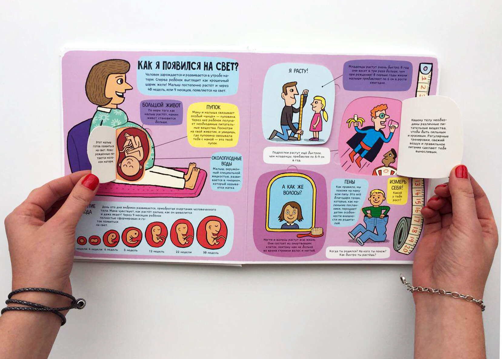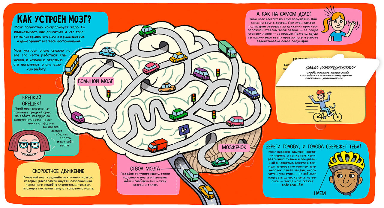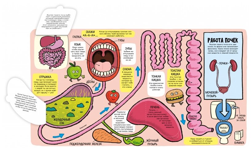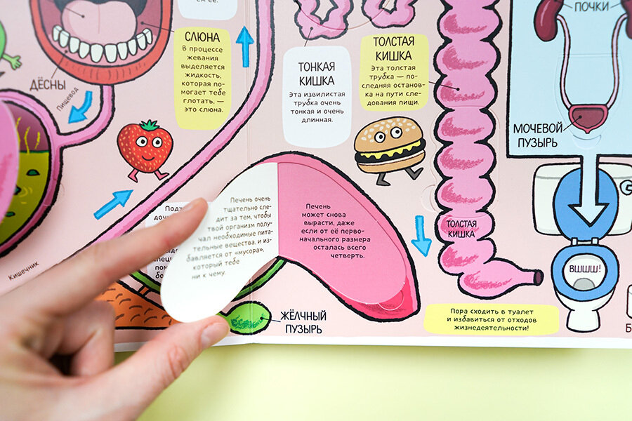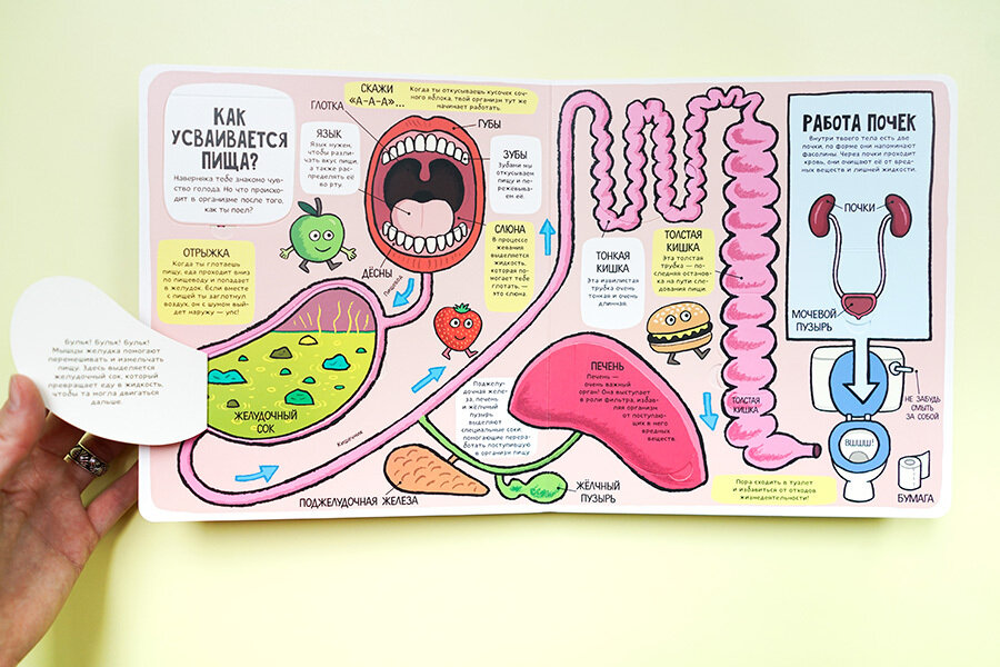 Все здесь описано просто и понятно, а главное - все показано на картинках, которые можно открыть. Хочешь заглянуть в голову - открывай ее и разглядывай мозг. Хочешь узнать, что происходит в желудке - открой окошко на животе и все увидишь.