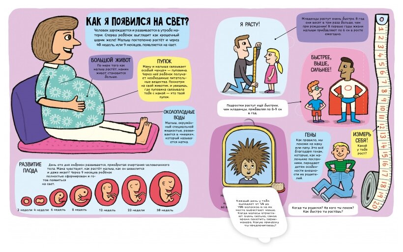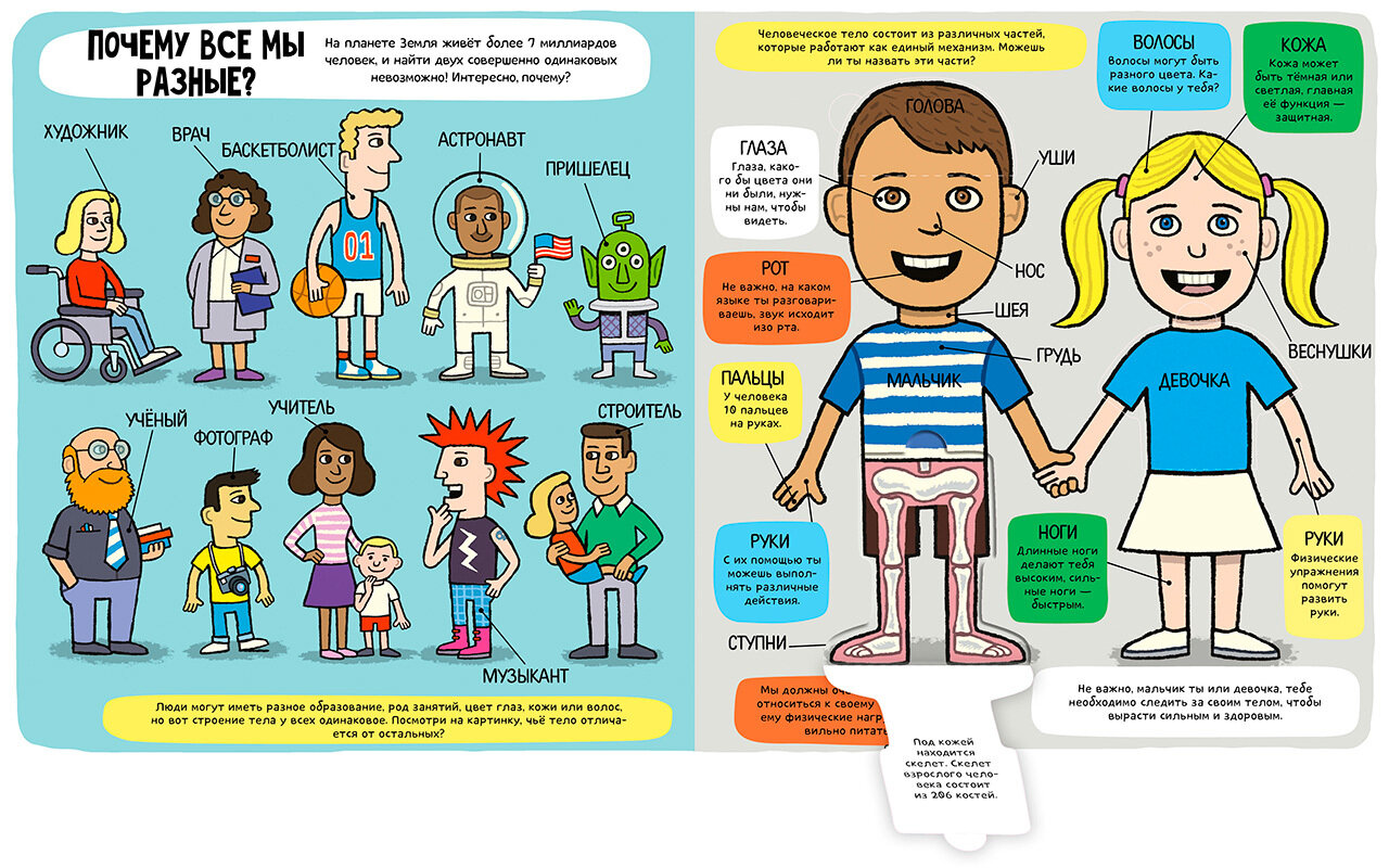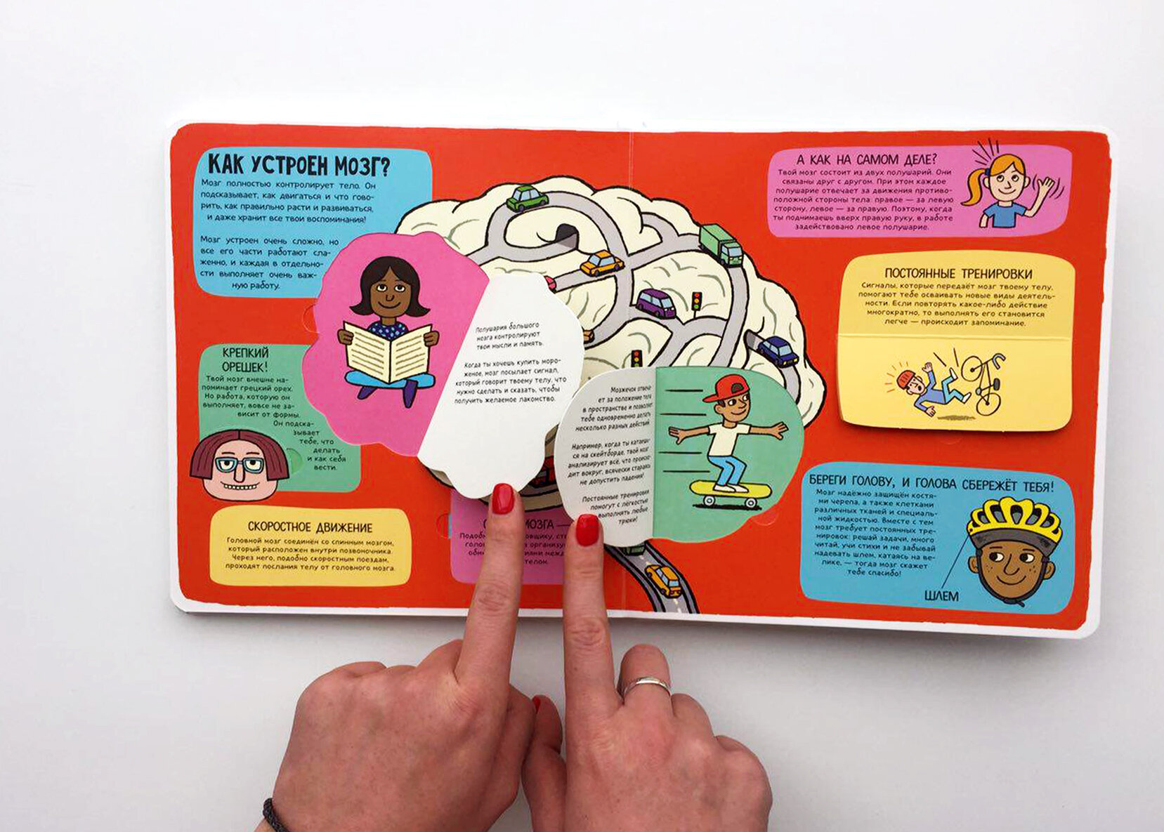Все здесь описано просто и понятно, а главное - все показано на картинках, которые можно открыть. Хочешь заглянуть в голову - открывай ее и разглядывай мозг. Хочешь узнать, что происходит в желудке - открой окошко на животе и все увидишь.