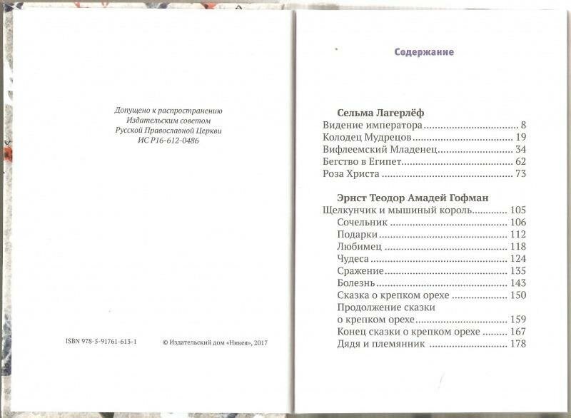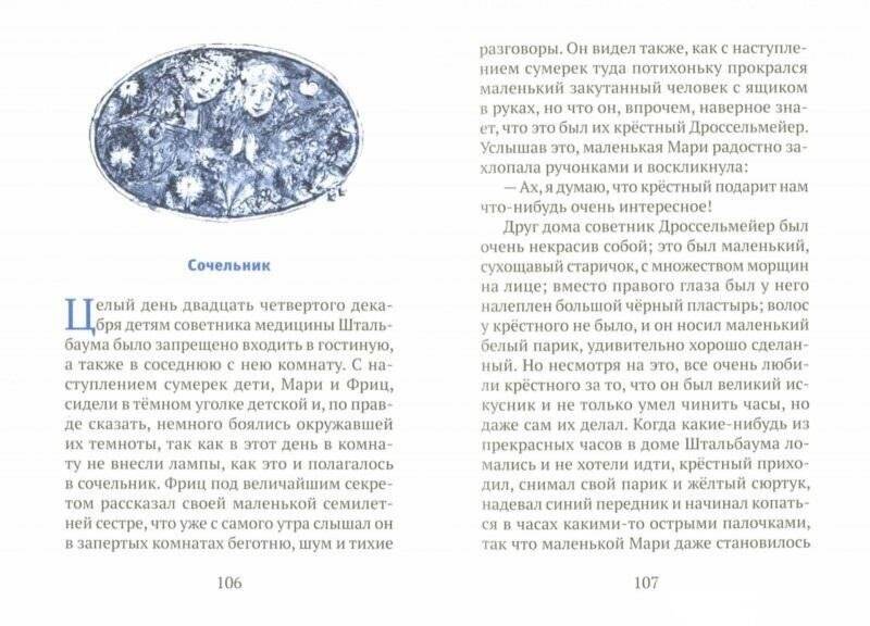 Далее приводятся два известнейших детских произведения рождественской тематики "Щелкунчик и Мышиный король" Э. Т. А. Гоффмана и "Снежная королева" Г. Х. Андерсена. К сожалению, имена переводчиков даются только для последнего произведения. Однако выбор авторов из произведений замечательный. "Щелкунчика" действительно надо обязательно сначала читать, а потом уже смотреть и слушать во множестве различных существующих интерпретаций. Потому что только при чтении открывается полный смысл этого произведения.