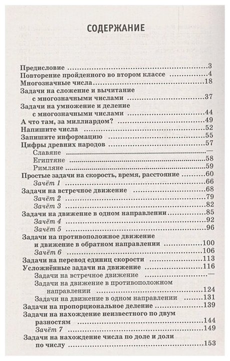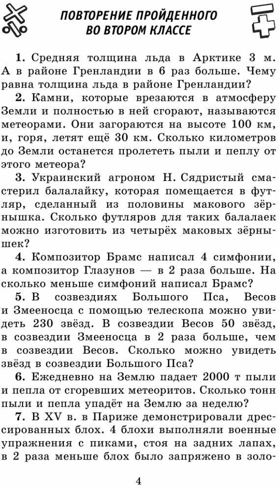 Задачник построен необычно - многие задачи являются также источником информации по типу сборника различных фактов - исторических, географических итп. Уже первый раздел - "Повторение пройденного во втором классе" - довольно сложный, включает в себя задачи на нахождение долей, действия с числами больше ста (мои дети этого не проходили во втором классе).