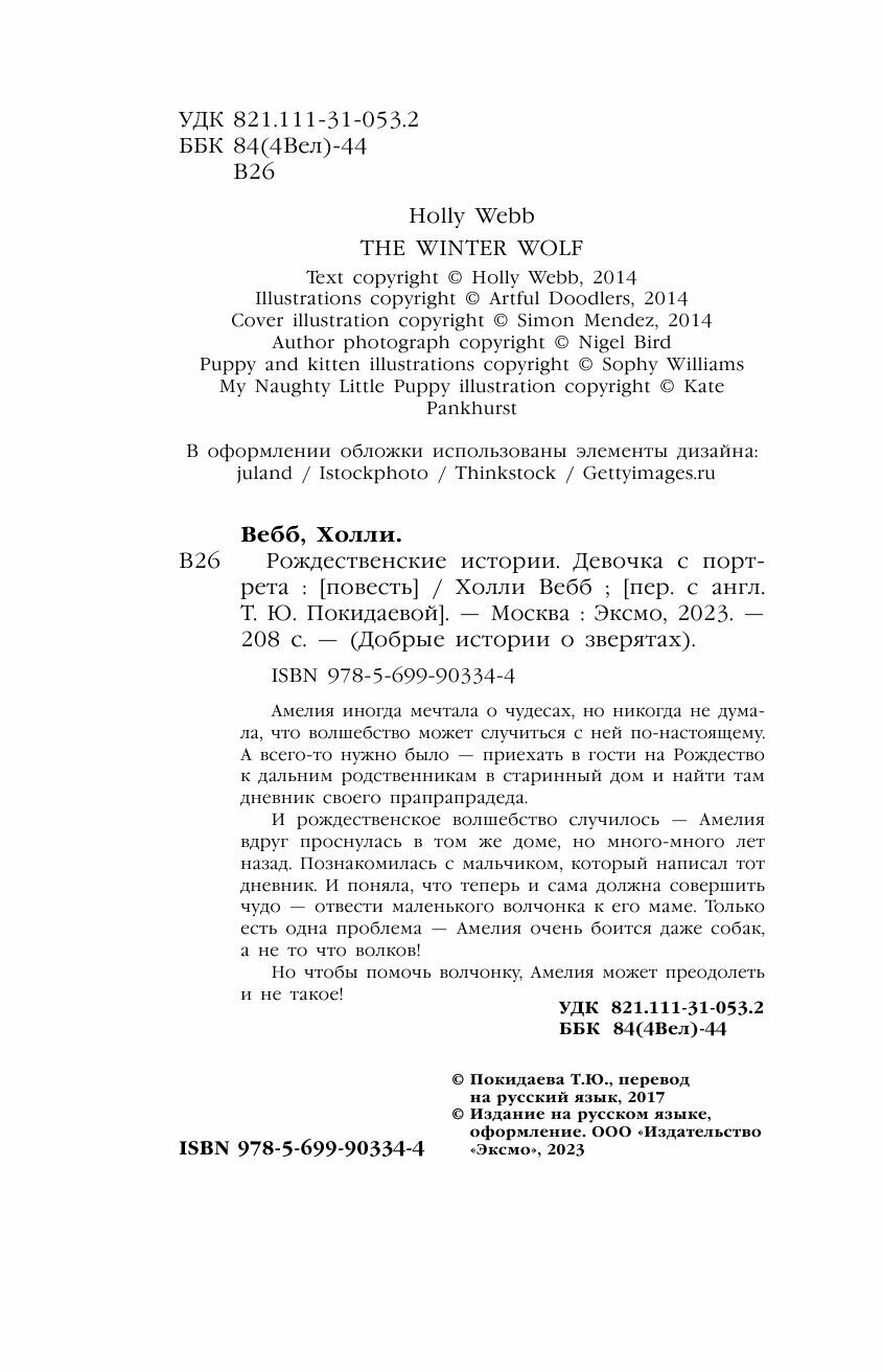 Книга из серии "Добрые истории о зверятах". Размер книги с школьную тетрадь, только поуже. Обложка цветная матовая с глиттером, частично нанесенным на рисунок зимней тематики. На обратной стороне обложки - аннотация к данной книге, также указан электронный адрес официальной группы издательства в социальной сети "вКонтакте". Всего в книге 208 страниц, страницы белые плотные, слегка просвечивает текст и рисунки с другой стороны. В конце книги - оглавление, после которого - информация о том, какие другие книги издательства "Эксмо" вышли. Книга рекомендована для среднего школьного возраста. Повесть состоит из 9 глав, каждую из которых завершают рукописные страницы из дневника прапрапрадеда главной героини, девочки с кудряшками, Амелии.Текст повести дополняют и украшают замечательные, трогательные черно-белые иллюстрации, которых в книге довольно много. Сюжет интересный, текст читается легко, шрифт крупный, есть переносы слов, буква "ё". Книга произвела приятное впечатление, подойдет в качестве подарка на Новый год.