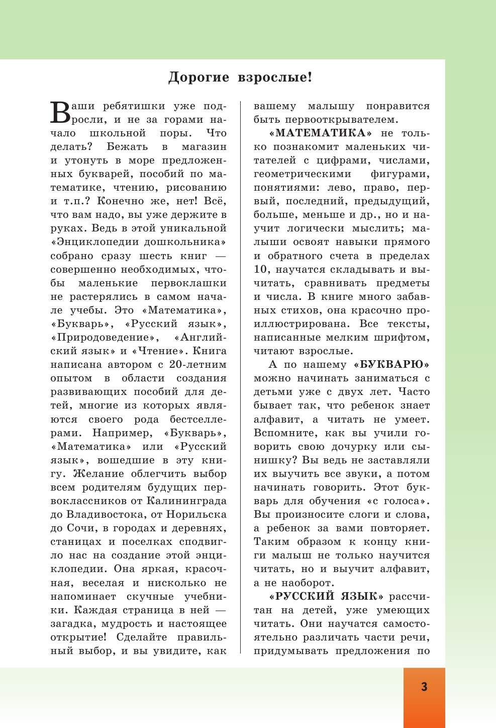 "Энциклопедия дошкольника" написана автором с многолетним опытом в области создания развивающих пособий для детей. Занятия по этой книге не требуют от родителей специальных знаний, поэтому ваш ребёнок легко пройдёт курс домашнего обучения и будет отлично подготовлен к школе.