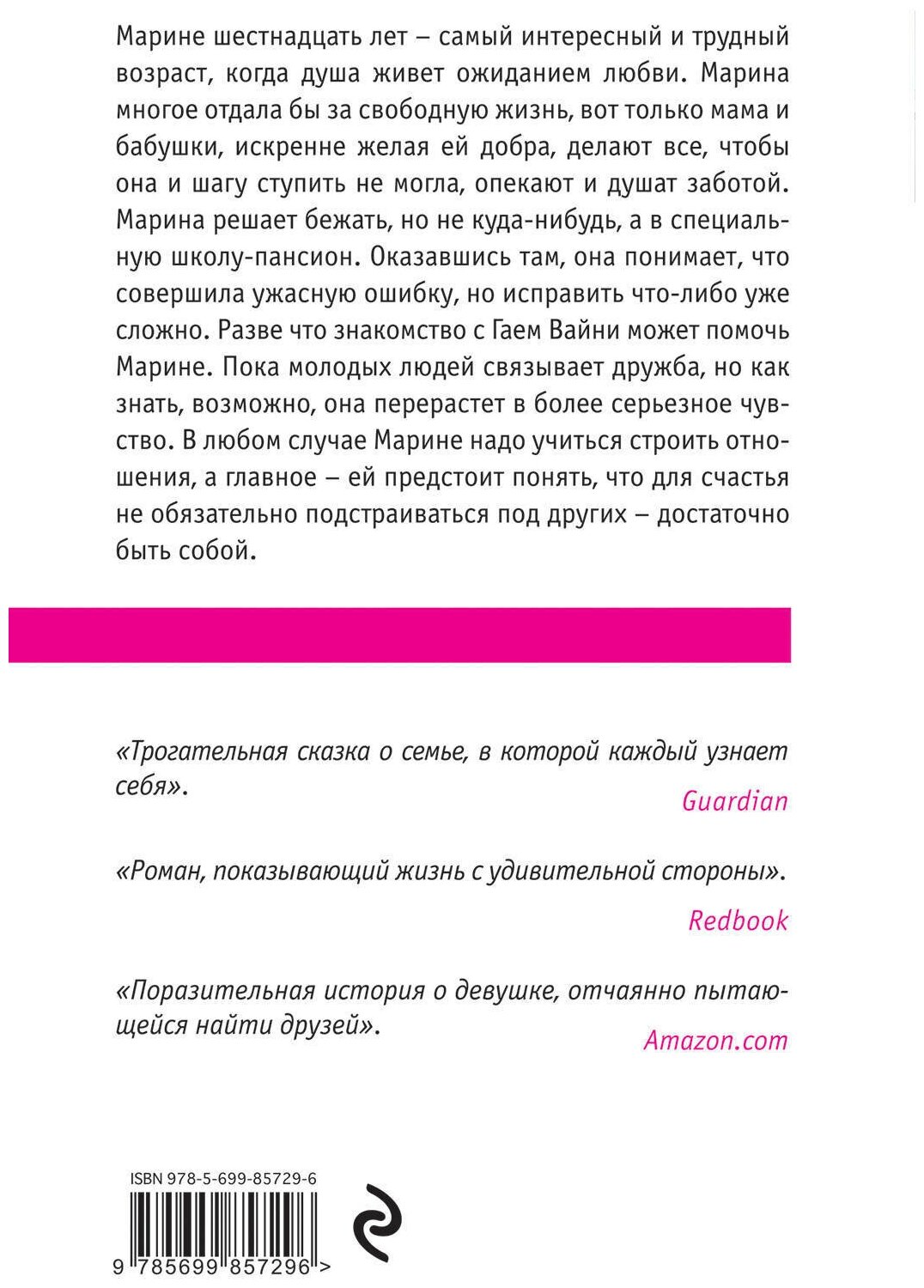 Марине шестнадцать лет - самый интересный и трудный возраст, когда душа живет ожиданием любви. Марина многое отдала бы за свободную жизнь, вот только мама и бабушки, искренне желая ей добра, делают все, чтобы она и шагу ступить не могла, опекают и душат заботой. Марина решает бежать, но не куда-нибудь, а в специальную школу-пансион. Оказавшись там, она понимает, что совершила ужасную ошибку, но исправить что-либо уже сложно. Разве что знакомство с Гаем Вайни может помочь Марине. Пока молодых людей связывает дружба, но, как знать, возможно она перерастет в более серьезное чувство. В любом случае Марине надо учиться строить отношения, а главное - ей предстоит понять, что для счастья не обязательно подстраиваться под других - достаточно быть собой.