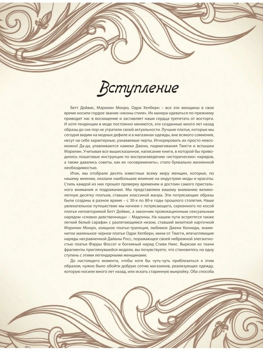 Книга "Шьем классические платья" придумана так: фотографии Мэрилин Монро, Одри Хебберн, Твигги, Жаклин Кеннеди, Мадонны и еще пятерых "икон стиля", описание и технический рисунок их платьев