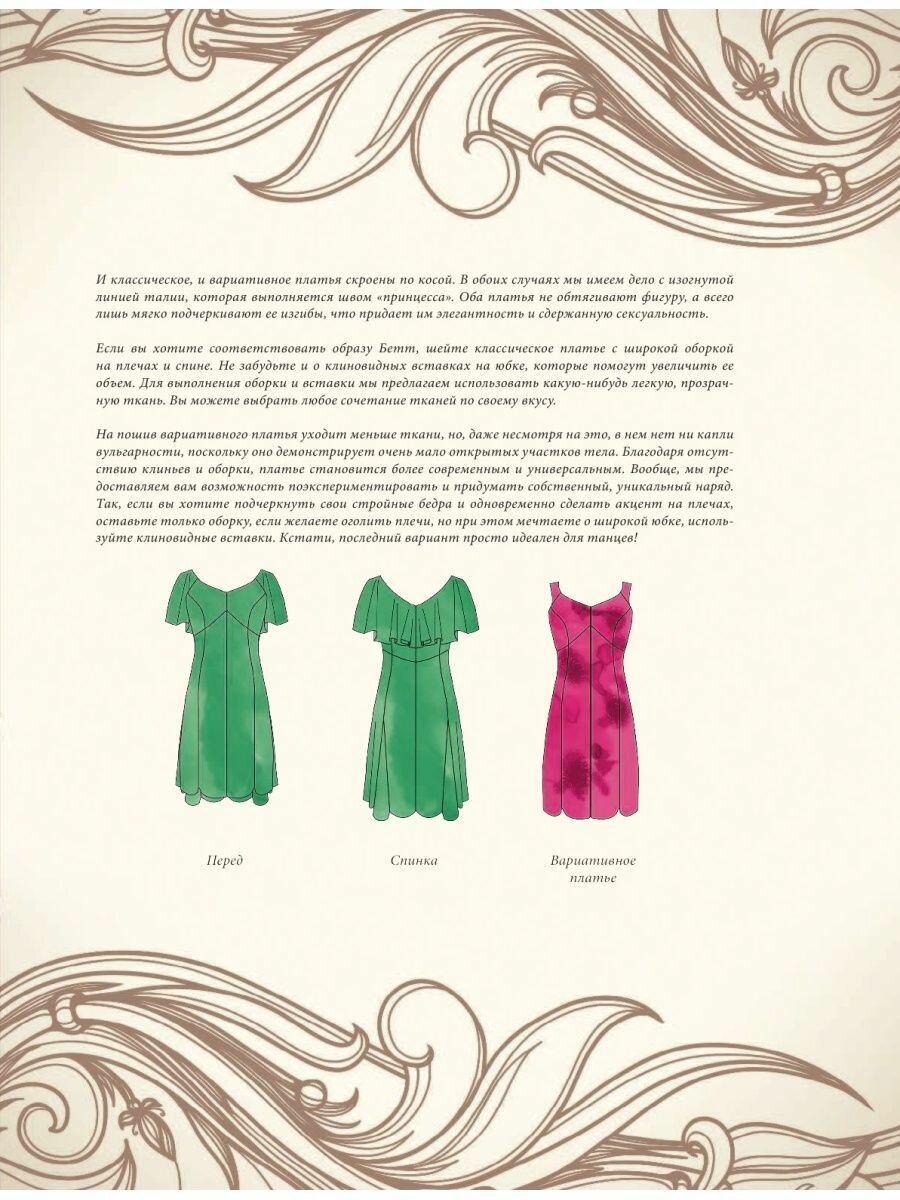 порядок шитья, выкройка для 4 размеров от 42 до 48 (обхват груди от 79 до 94 см, бедер от 88 до 103 см) в масштабе 1:4. Платья без подкладки, уровень сложности средний. И еще рисунки вариаций на тему этих платьев.