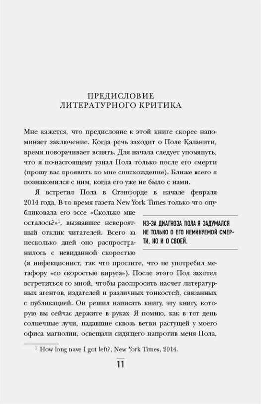 Талантливого нейрохирурга Пола Каланити ждало прекрасное будущее: блестящая карьера, звание профессора, спокойная семейная жизнь с молодой женой, дети… Ему было всего 36 лет, когда все планы рухнули, как хрупкий карточный домик: рак легких, последняя стадия. Смерть, прятавшаяся в палатах пациентов, на этот раз поймала за руку его самого. Еще вчера Пол двигался к завершению резидентуры, осваивал сложнейшие операции, вел исследовательскую деятельность, должен был стать профессором нейрохирургии. И вот теперь он будет человеком, лежащим на больничной койке в ожидании результатов многочисленных анализов… Но еще он будет тем, кто не бросит проводить операции из-за болезни, кто станет еще больше любить своих близких и, наконец, узнает, каково это - быть отцом. Пол решил, что постарается написать книгу, даже если не успеет ее закончить, просто потому что всегда мечтал об этом.