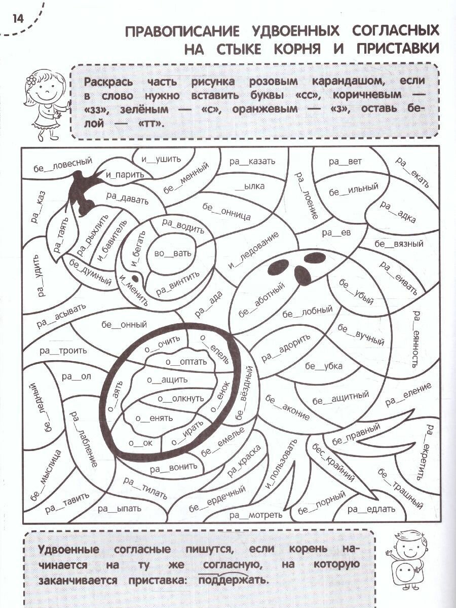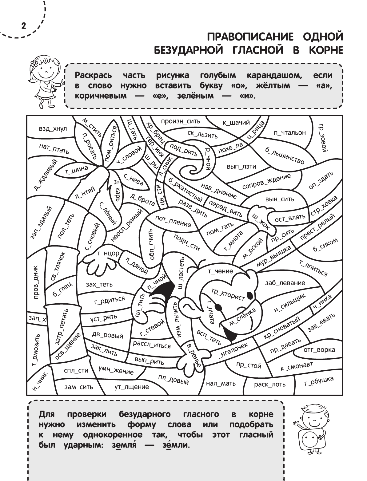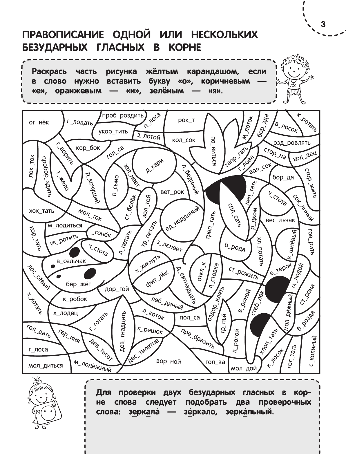 Данная книга- раскраска не только поможет снять вашему ребёнку стресс, но и поможет закрепить такие темы, как например, Правописание безударных гласных в корне, Правописание чередующихся согласных в корне, Правописание удвоенных согласных, Правописание гласных в приставках, Правописание суффиксов и многие другие темы. Очень рекомендую!