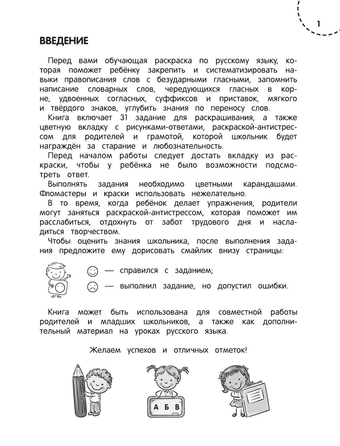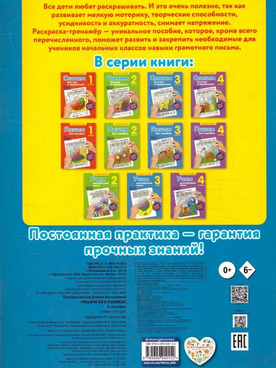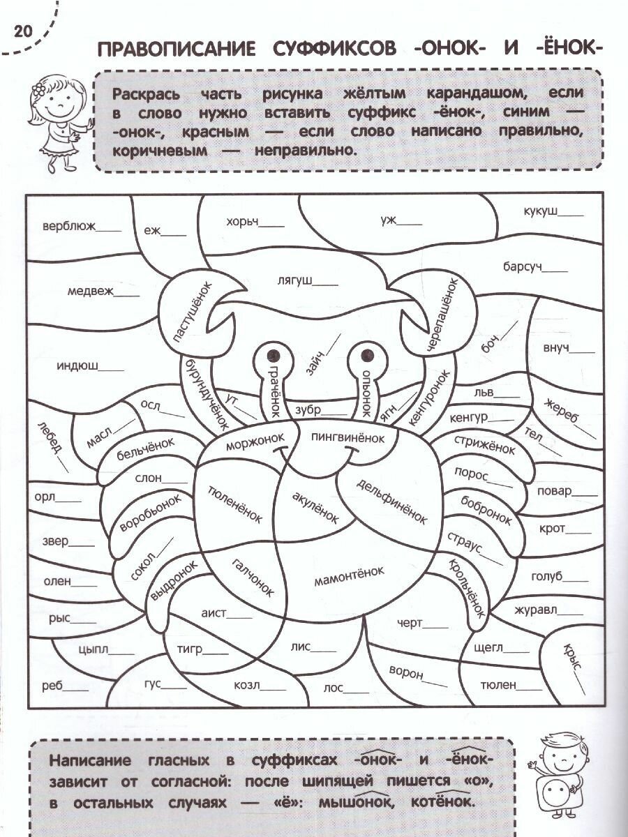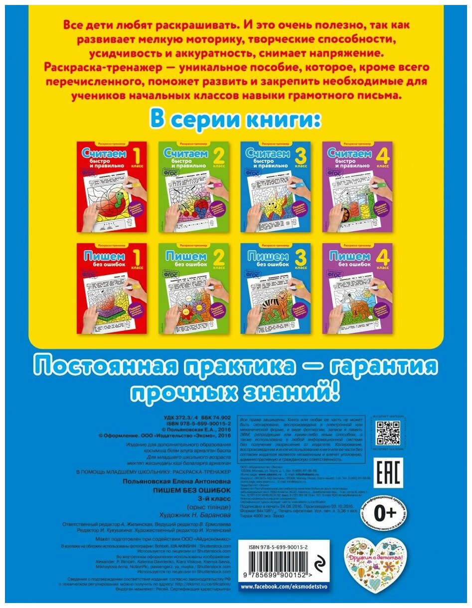 Данная книга- раскраска не только поможет снять вашему ребёнку стресс, но и поможет закрепить такие темы, как например, Правописание безударных гласных в корне, Правописание чередующихся согласных в корне, Правописание удвоенных согласных, Правописание гласных в приставках, Правописание суффиксов и многие другие темы. Очень рекомендую!