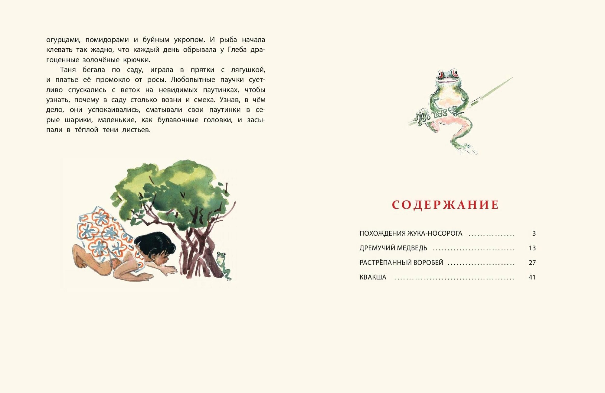 Жук-носорог станет героем войны, звери и деревья спасут маленького мальчика от дремучего медведя, растрепанный воробей Пашка победит коварную ворону, а из лягушки вдруг получится предсказательница…