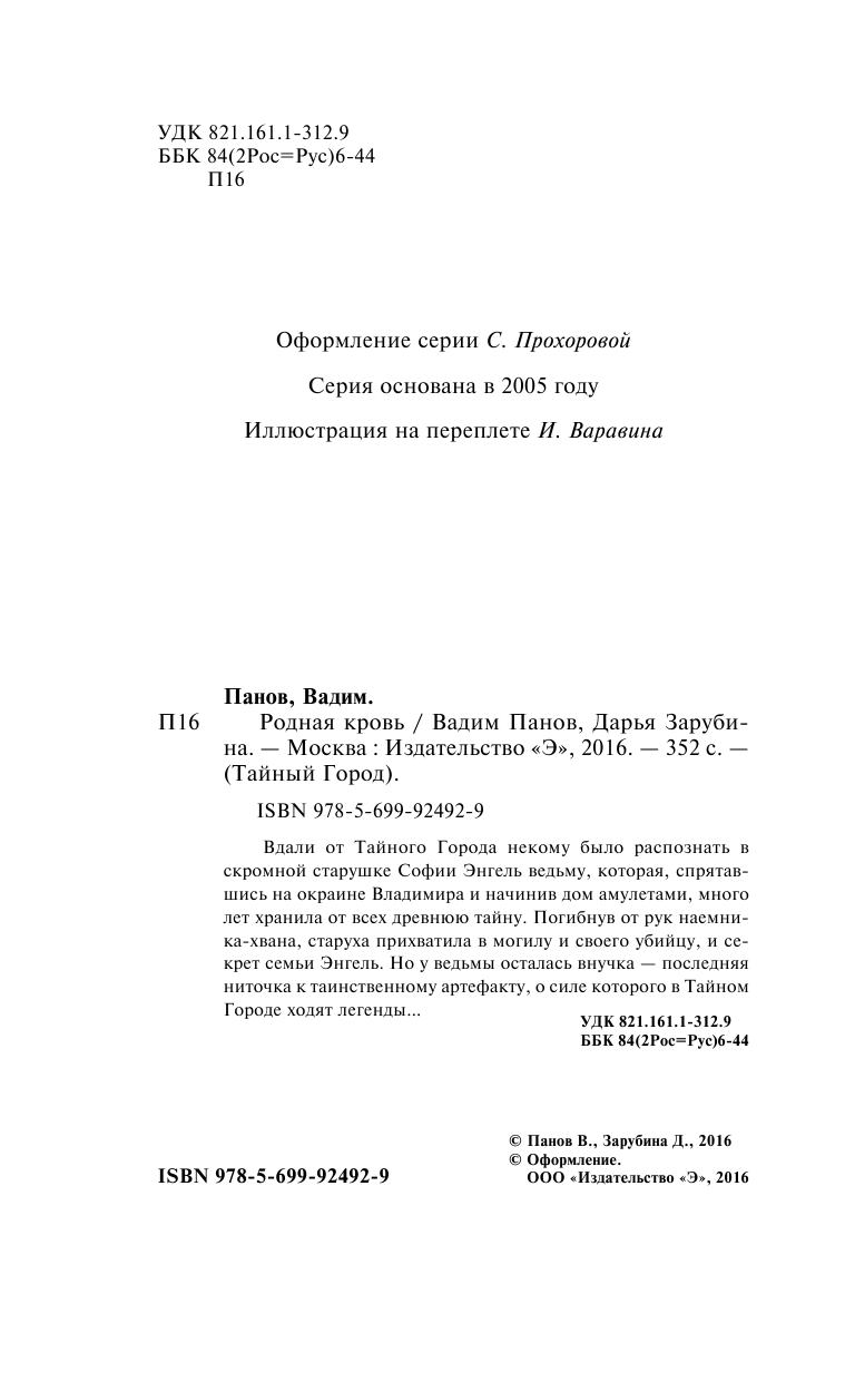 Цикл «Тайный Город» знаком мне давно, но руки как-то не доходили начать читать романы, относящиеся к этому миру. Ситуацию усугубил одноимённый сериал, который, кроме желания побыстрее выключить телевизор, другого желания не вызвал, и я попросту забыл о «ТГ». Каково же было моё удивление, когда я узнал, что ивановская писательница Дарья Зарубина, творчество которой я уважаю и ценю, написала в соавторстве с Вадимом Пановым (для тех, кто до сих пор не знает, Вадим Панов – создатель мира «ТГ») роман «Родная кровь». Решение о том, что я должен прочитать эту книгу, было принято сразу – прочитаю и напишу отзыв. Единственное, что смущало меня, это отсутствие знаний о мире «ТГ». Спасибо интернету, который позволил вкратце ознакомиться с матчастью… и вот я уже перелистываю первую страницу…