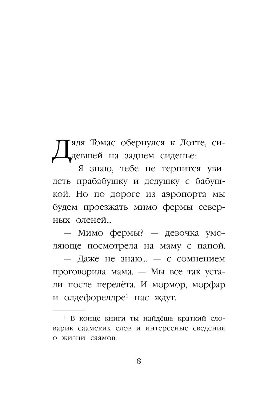 На ночь мама часто рассказывала Лотте истории из жизни прабабушки. Та была настоящей сказочной героиней — ездила в санях, запряженных оленем, как Санта-Клаус, пасла оленье стадо, отгоняла от него волков и даже сама шила себе одежду. Девочка мечтала хоть одним глазком взглянуть на эту волшебную жизнь — и её желание сбылось. Лотта вдруг проснулась в другом месте и в другом времени — том самом, знакомом по историям. В сказке, конечно, быть очень увлекательно, но дома всё-таки лучше. А чтобы вернуться, Лотте нужно совершить рождественское чудо и найти маму маленького оленёнка Карла!