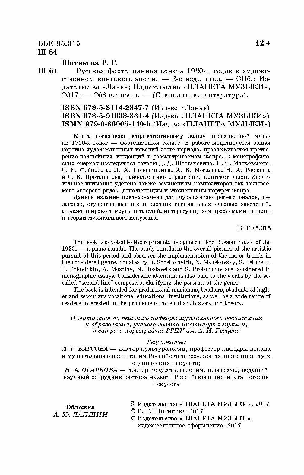 Русская фортепианная соната 1920-х годов в художественном контексте эпохи. Учебное пособие (Р. Г. Шитикова); Издательство «Планета музыки», 2017