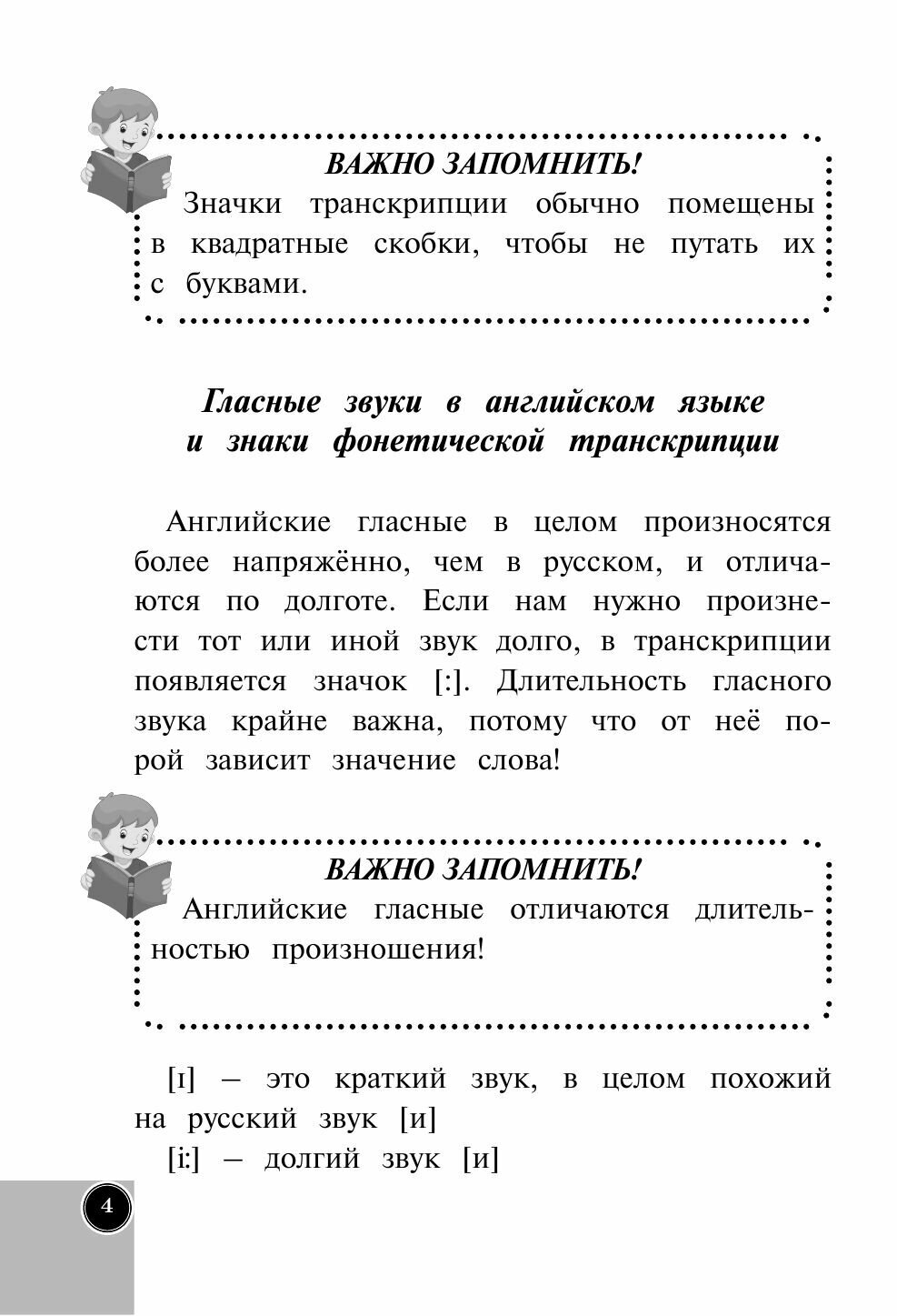 Пособие хорошо подойдет для дополнительных занятий с детьми дома, для повторения пройденного в школе. В начале книги помещен краткий фонетический курс (в первую очередь ориентированный на родителей, которые не очень хорошо помнят особенности произношения английских звуков). Дальше идут уроки, построенные по схеме: "грамматика+лексика", упражнения, итоговый текст урока. Все очень близко к школьной программе. Тексты для чтения нескучные: интересные факты про цвета, транспортные средства, мировые достопримечательности и т.д.
