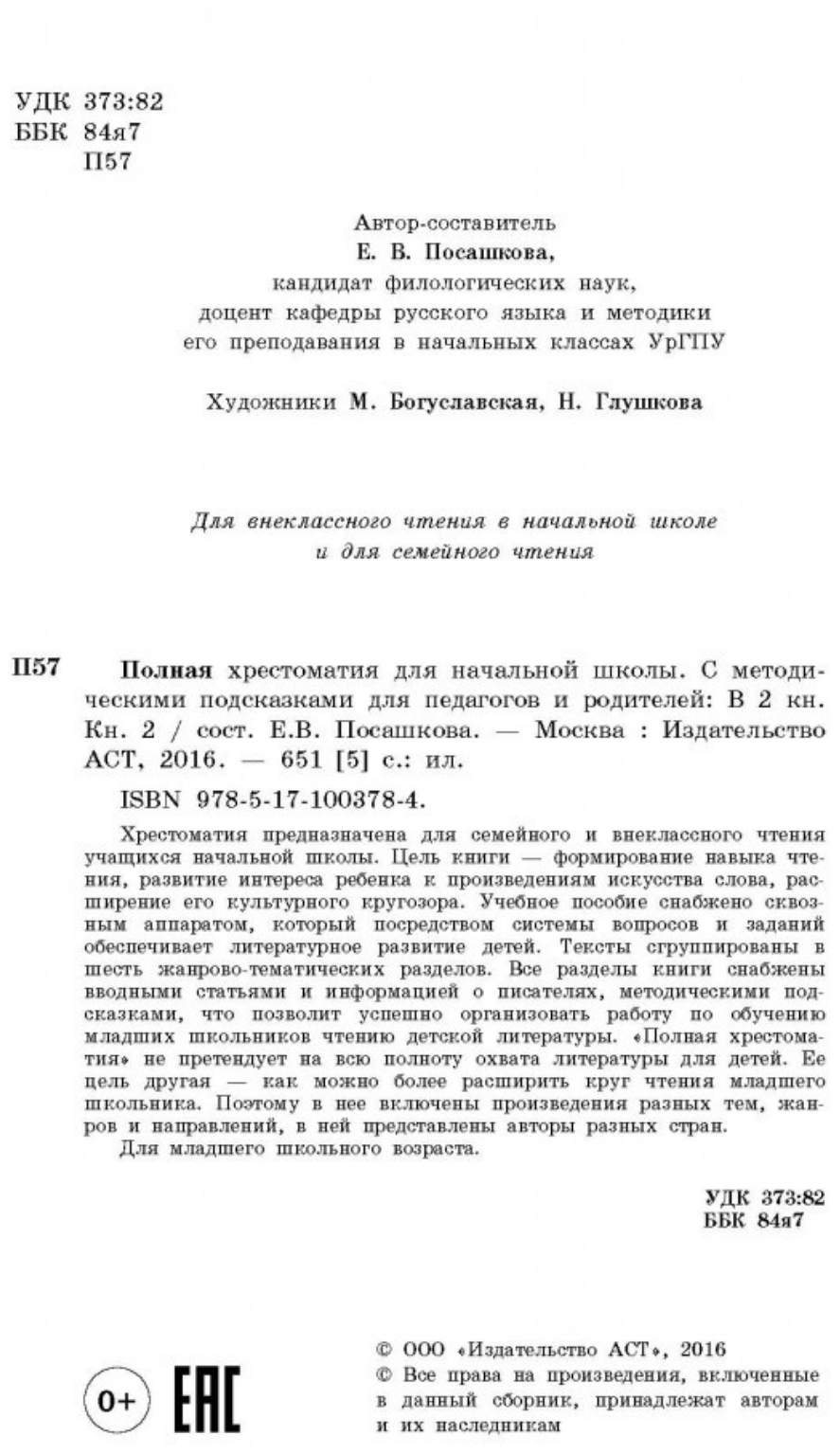 Хрестоматия предназначена для семейного и внеклассного чтения учащихся начальной школы. Цель книги - формирование навыка чтения, развитие интереса ребенка к произведениям искусства слова, расширение его культурного кругозора. Учебное пособие снабжено сквозным аппаратом, который посредством системы вопросов и заданий обеспечивает литературное развитие детей. Тексты сгруппированы в шесть жанрово-тематических разделов. Все разделы книги снабжены вводными статьями и информацией о писателях, методическими подсказками, что позволит успешно организовать работу по обучению младших школьников чтению детской литературы. "Полная хрестоматия" не претендует на всю полноту охвата литературы для детей. Ее цель другая - как можно более расширить круг чтения младшего школьника. Поэтому в нее включены произведения разных тем, жанров и направлений, в ней представлены авторы разных стран.