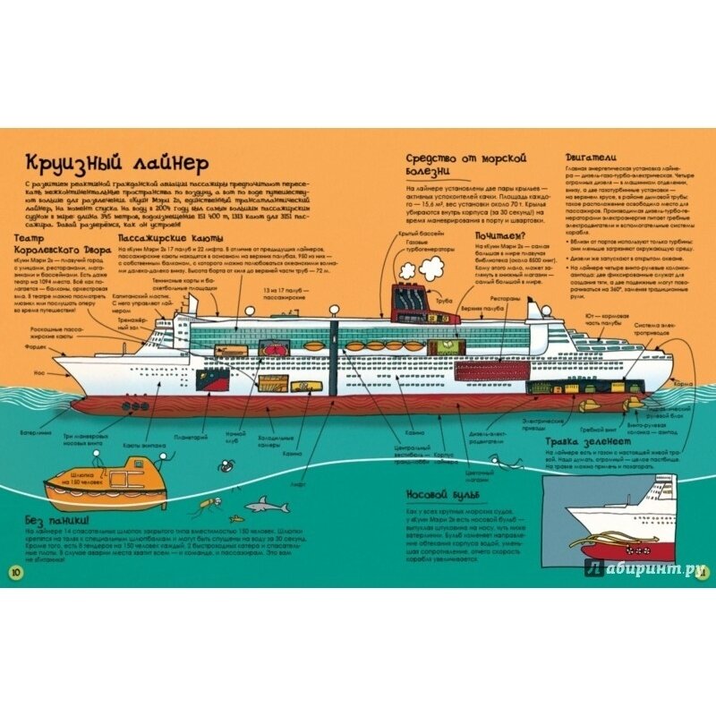 Первая страница - разные интересные факты из области мореплавания - сколько всего в мире зарегистрировано кораблей, самый большой порт мира, крупнейшие суда и т.п. Второй разворот - история развития судоходства в картинках и фактах. Далее описывается устройство различных типов кораблей - круизного лайнера, яхты, контейнеровоза, подводной лодки, батискафа, а также рассказывается об устройстве капитанского мостика, двигателей и движетелей кораблей, объясняется, почему они не тонут. В конце - небольшой словарик.