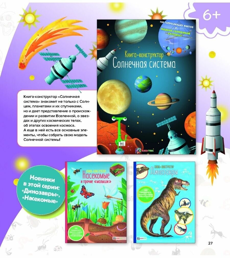 Получили книгу "Солнечная система, Книга-конструктор". Мне и ребёнку она очень понравилась. Предлагается вырезать и сделать модель солнечной системы. В качестве основы предложено использовать две палки или рейки длиной 1м. И дополнительно в приложении есть мелкие детали (космонавт, спутники, инопланетянин,ракета и т.д.) , чтобы ребенок мог украсить по желанию свою солнечную систему.В конце книги -познавательный материал про каждую планету, про происхождение вселенной и про космические путешествия. Моему сыну 8 лети книга его очень заинтересовала. Книга-конструктор рассчитана на детей с 6 лет.