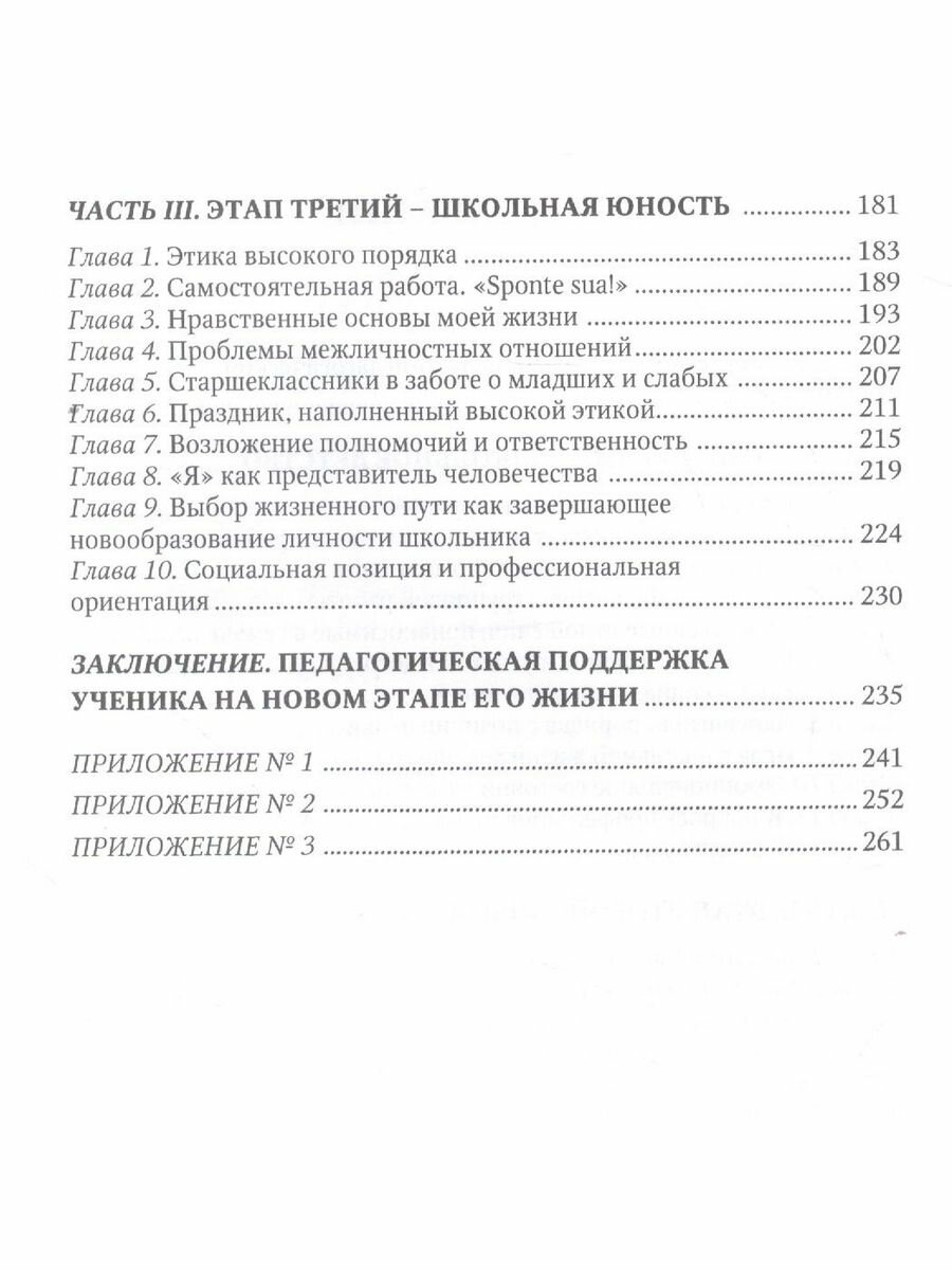 В третьей части рассматриваются содержание, методика и технология, а также средства содействия нравственному восхождению и этическому образованию юношества, стоящего на пороге взрослой жизни перед самостоятельным выбором жизненного пути.