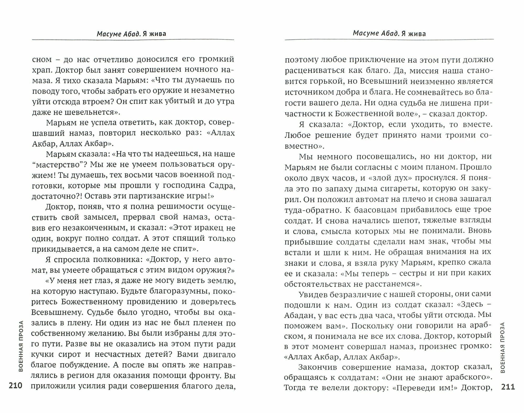 Иранке Масуме Абад было 18 лет, когда началась Ирано-иракская война. И практически в самом начале войны, осенью 1980 года она попала в плен недалеко от своего родного города Абадана, который с первых дней войны оказался на линии фронта. Она и еще три иранские девушки были вывезены на территорию Ирака и помещены в багдадскую тюрьму «Ар-Рашид», где провели около полутора лет, считаясь в Иране пропавшими без вести. В конце концов они объявили голодовку и добились, чтобы их зарегистрировали как пленных в Международном комитете Красного Креста. После этого они были переведены в лагерь для военнопленных в Мосуле, а оттуда – в лагерь «Аль-Анбар». В феврале 1984 года они были неожиданно для себя освобождены и отправлены в Иран. Спустя много лет Масуме Абад написала воспоминания о своей жизни в плену. Книга эта очень интересна. Против моих ожиданий, читать ее было не так тяжело, как книги о сталинских и фашистских лагерях. И я до сих пор не могу разобраться, почему: то ли потому, что в иракском плену было не настолько ужасно, то ли потому, что автор описывает плен со смирением, свойственным глубоко религиозному человеку. С одной стороны, девушки содержались в ужасных условиях, жили в камере с мышами и блохами, были лишены элементарных гигиенических средств, страдали от болезней и отсутствия медицинской помощи. С другой стороны, они не подвергались такому насилию, какому в тюрьме и лагерях подвергались мужчины (причем большинство пленных были военными достаточно высокого ранга). Если мужчин пытали и мучили систематически, то девушки подверглись избиению только один раз, сексуальному насилию не подвергались, на принудительных работах не работали. Возможно, это связано с разным отношениям к мужчинам и женщинам у мусульман. Честно говоря, каковы были цели содержания гражданских девушек в лагере военнопленных, не очень понятно. Возможно, потом иракцы обменяли их на своих пленных (автор этого не объясняет). Безусловно, эта книга – бесценное свидетельство о событиях не столь давних, но о которых российскому читателю мало что известно. Жаль, что военные конфликты и связанные с ними страдания людей продолжаются и сейчас… Однако книга интересна не только описанием жизни в плену. Первые главы рассказывают о детстве автора, поэтому много можно узнать о жизни в Иране в 1960-1970-е годы, об Исламской революции. Интересна и личность автора. Масуме Абад – очень религиозный человек, она с восторгом встретила победу Исламской революции. Понятия ислама и родины неразрывно связаны в ее сознании. Именно вера и стремление не посрамить родину поддерживали силу ее духа, помогли пережить плен и воспринимать ужасы, омрачившие ее юность, как испытание, посланное Аллахом и которое необходимо преодолеть. Не может не радовать, что Масуме Абад действительно удалось преодолеть все испытания и вернуться в Иран. После освобождения она вышла замуж, родила трех дочерей и рассказала о своем горестном опыте всему миру.
