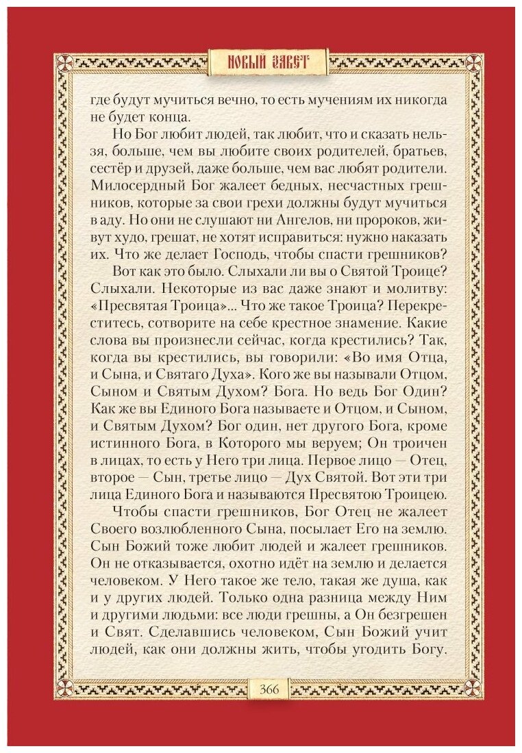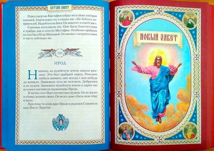 Купили Библию в подарок сыну, очень хорошая книга, сначала до 7лет читали детскую,подросли и выбрали эту,очень хорошо,что есть и Ветхий Завет и Новый Завет,описано все доступно и понятно, не сложным языком,картинки есть цветные,формат текста хороший,эта книга должна быть у каждого отрока, я очень довольна выбором и купила по скидке.Советую приобрести у кого нет,обязательно куплю ещё одну если надо на подарок.