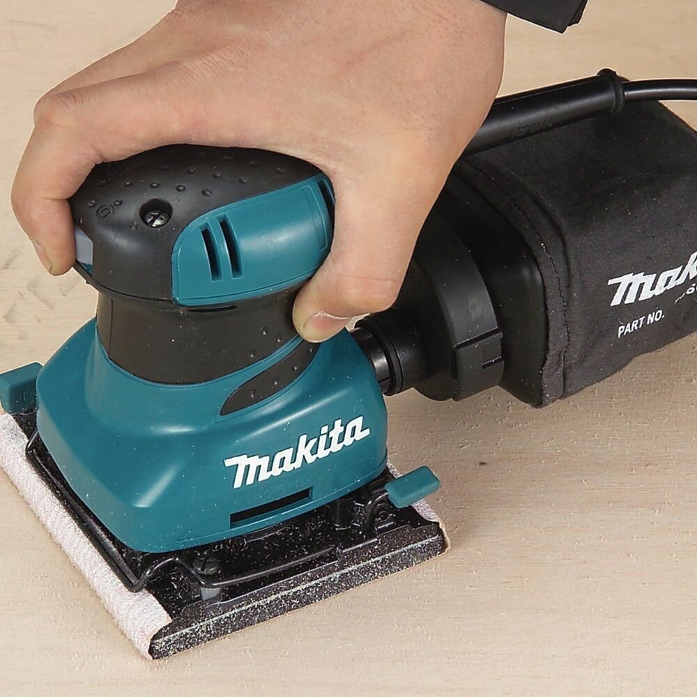 Вибрационная шлифовальная машина Makita использует быстросменные листы абразивной бумаги на липучке или при помощи зажимов. Оснащена эффективным удалением пыли через опорную плиту с возможностью подключения к пылесоса.