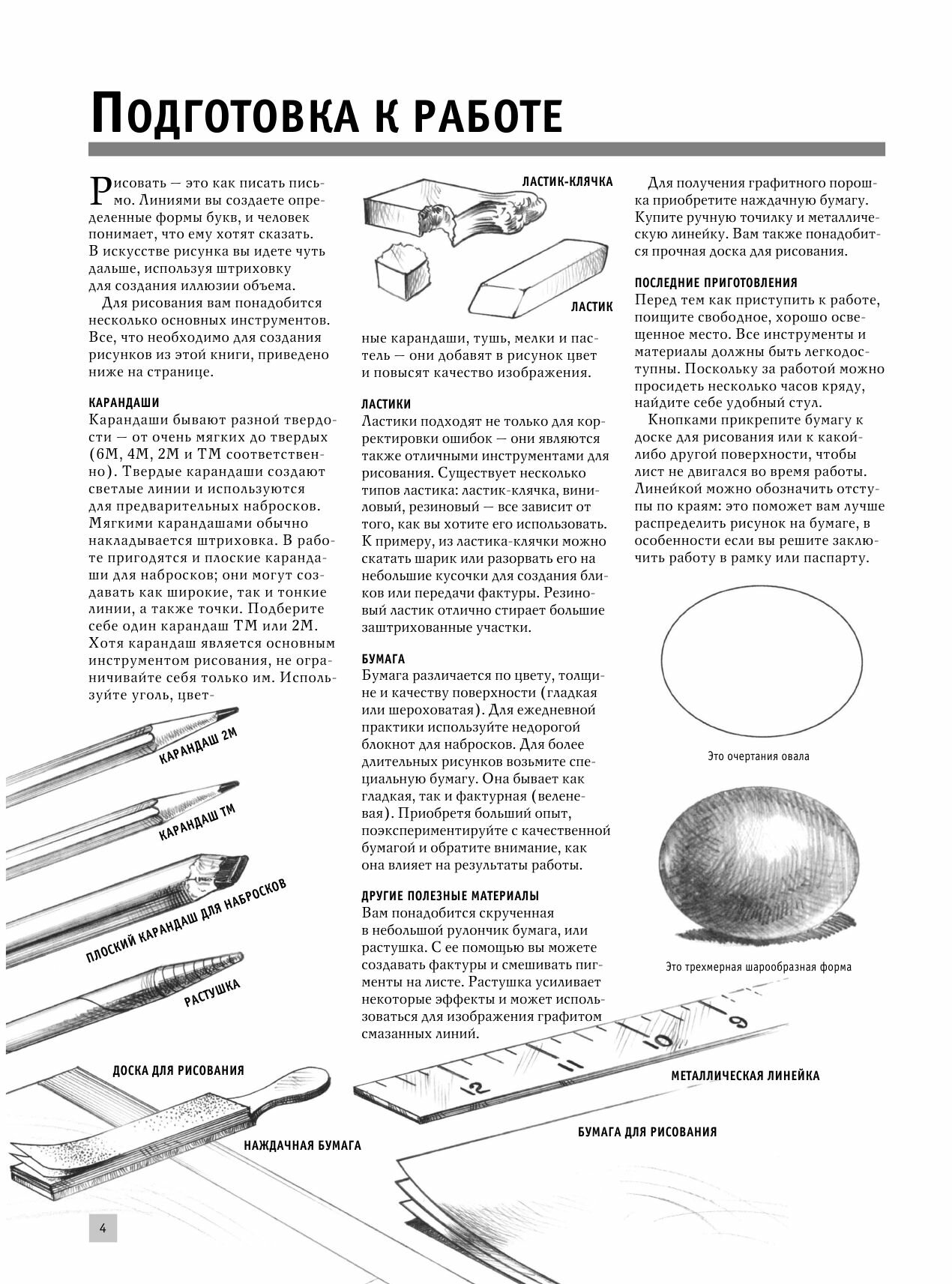 В начале книги описаны базовые вещи, касаемые рисунка карандашом, однако , отмечу, что вся книга рассчитана на человека уже знакомого с техникой штрихования, азами рисунка и так далее.