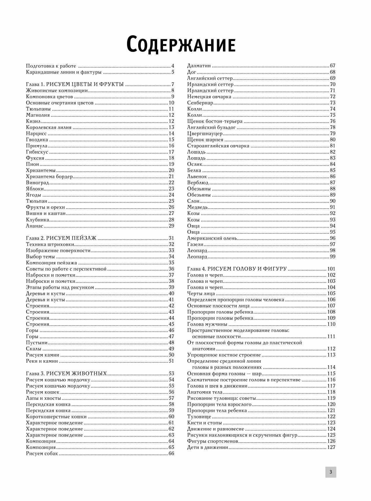 Книга имеет хорошее содержание: рисуем цветы и фрукты, рисуем пейзаж, рисуем животных, рисуем голову и фигуру.