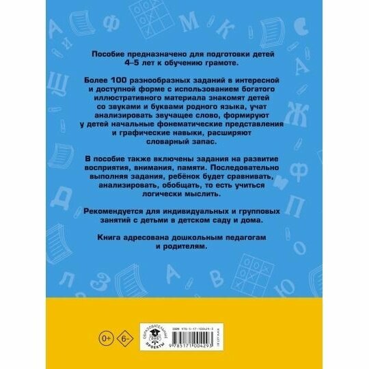 Более 100 разнообразных заданий в интересной и доступной форме с использованием богатого иллюстративного материала знакомят детей со звуками и буквами родного языка, учат анализировать звучащее слово, формируют у детей начальные фонематические представления и графические навыки, расширяют словарный запас. В пособие также включены задания на развитие восприятия, внимания, памяти. Последовательно выполняя задания, ребёнок будет сравнивать, анализировать, обобщать, то есть учиться логически мыслить.