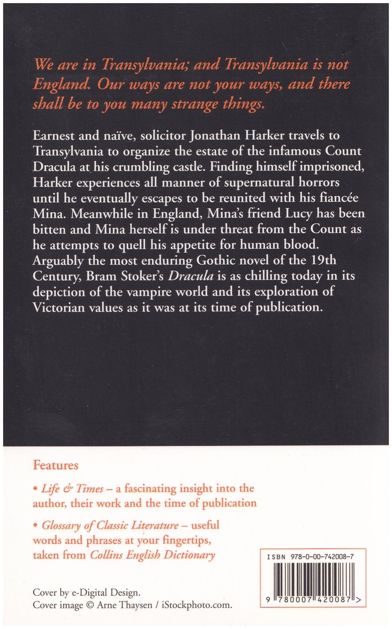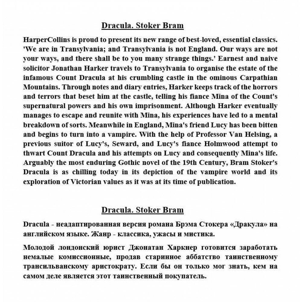 Dracula — неадаптированная версия романа Брэма Стокера «Дракула» на английском языке. Жанр — классика, ужасы и мистика. Молодой лондонский юрист Джонатан Харкнер готовится заработать немалые комиссионные, продав старинное аббатство таинственному трансильванскому аристократу. Если бы он только мог знать, кем на самом деле является этот таинственный покупатель. HarperCollins is proud to present its new range of best-loved, essential classics. ’We are in Transylvania; and Transylvania is not England. Our ways are not your ways, and there shall be to you many strange things.’ Earnest and naive solicitor Jonathan Harker travels to Transylvania to organise the estate of the infamous Count Dracula at his crumbling castle in the ominous Carpathian Mountains. Through notes and diary entries, Harker keeps track of the horrors and terrors that beset him at the castle, telling his fiance Mina of the Count’s supernatural powers and his own imprisonment. Although Harker eventually manages to escape and reunite with Mina, his experiences have led to a mental breakdown of sorts. Meanwhile in England, Mina’s friend Lucy has been bitten and begins to turn into a vampire. With the help of Professor Van Helsing, a previous suitor of Lucy’s, Seward, and Lucy’s fiance Holmwood attempt to thwart Count Dracula and his attempts on Lucy and consequently Mina’s life. Arguably the most enduring Gothic novel of the 19th Century, Bram Stoker’s Dracula is as chilling today in its depiction of the vampire world and its exploration of Victorian values as it was at its time of publication.