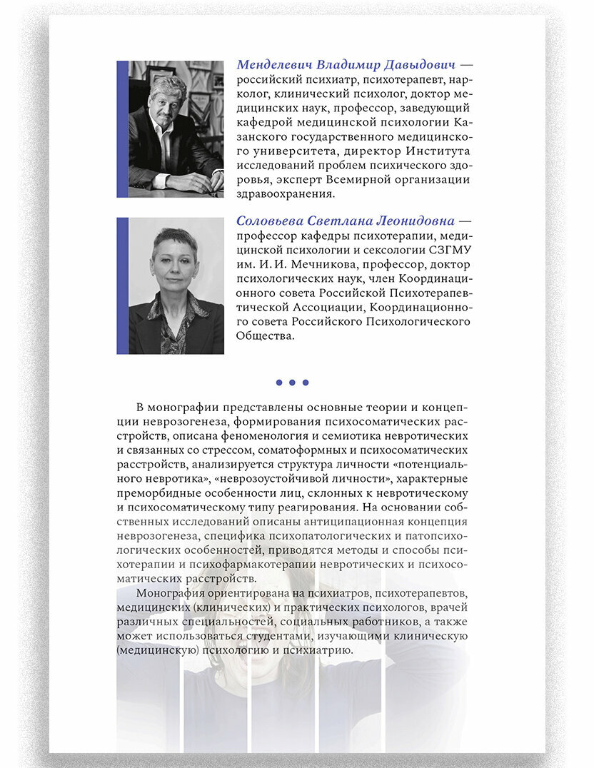 В монографии представлены основные теории и концепции неврозогенеза, формирования психосоматических расстройств, описана феноменология и семиотика невротических и связанных со стрессом, соматоформных и психосоматических расстройств, анализируется структура личности потенциального невротика, неврозоустойчивой личности, характерные преморбидные особенности лиц, склонных к невротическому и псиохсоматическому типу реагирования. На основании собственных исследований описана антиципационная концепция неврозогенеза, специфика психопатологических и патопсихологических особенностей, приводятся методы и способы психотерапии и психофармакотерапии невротических и психосоматических расстройств.