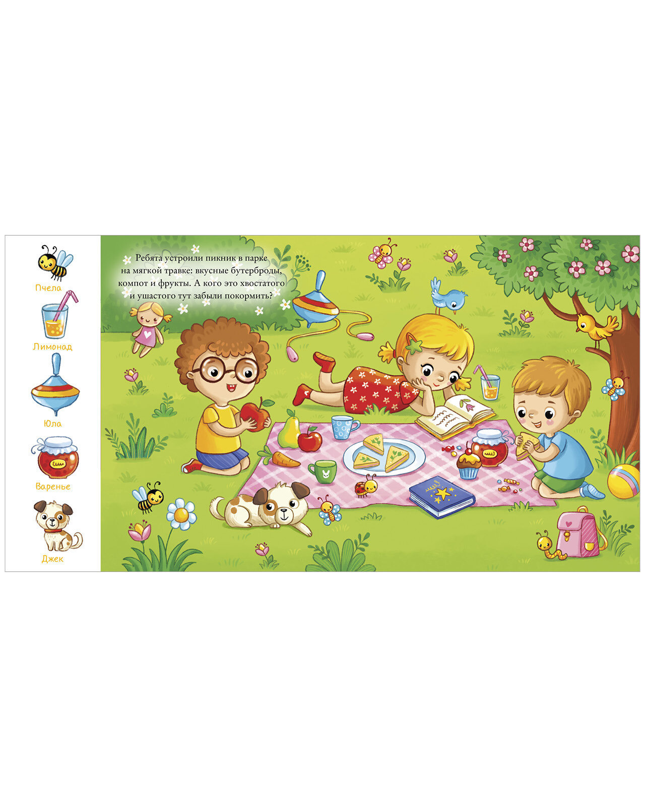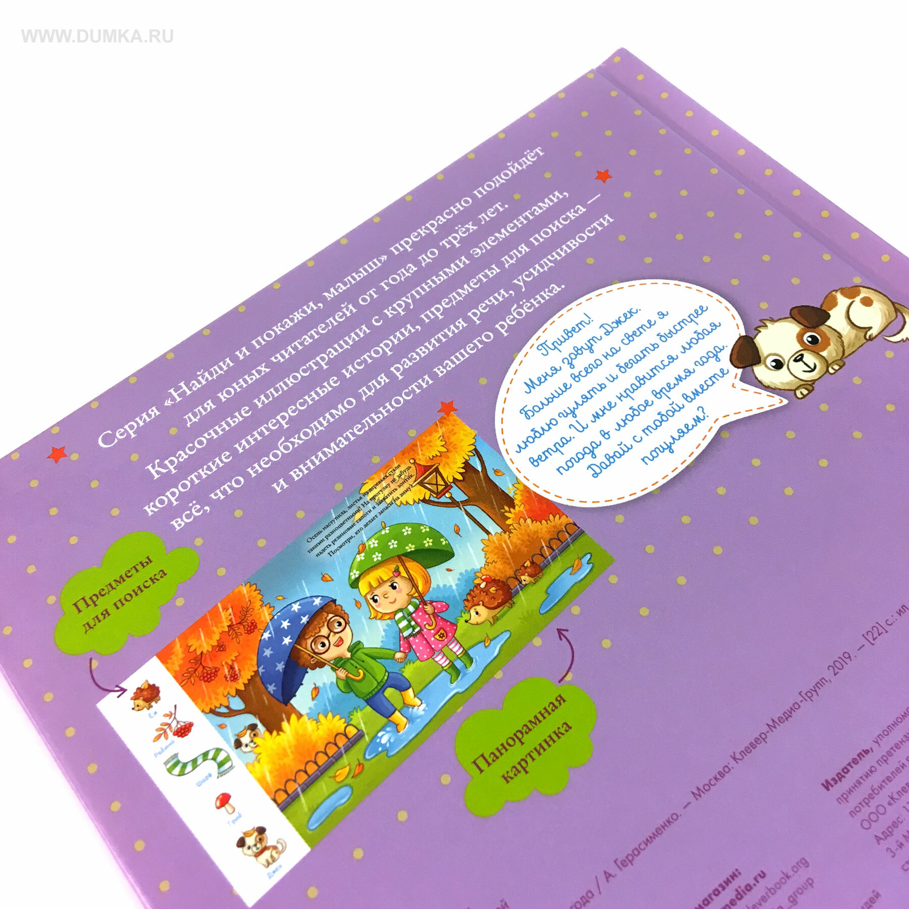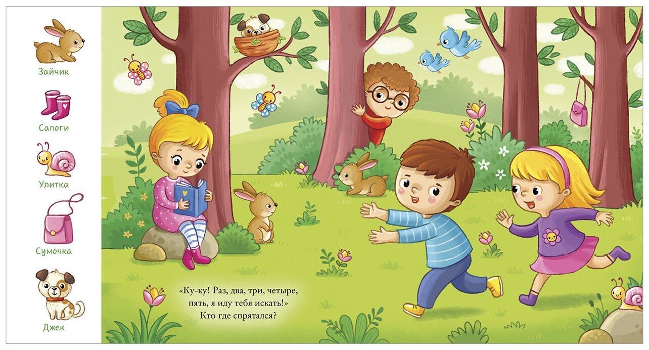 Каждая страница - это целый мир, в котором нужно найти 5 спрятанных предметов. Многие предметы ребенок с радостью узнает, а с некоторыми познакомится. И не забудьте, что один симпатичный герой - песик Боня - проведет вас через всю книжку! Его нужно будет найти и показать на каждом развороте.