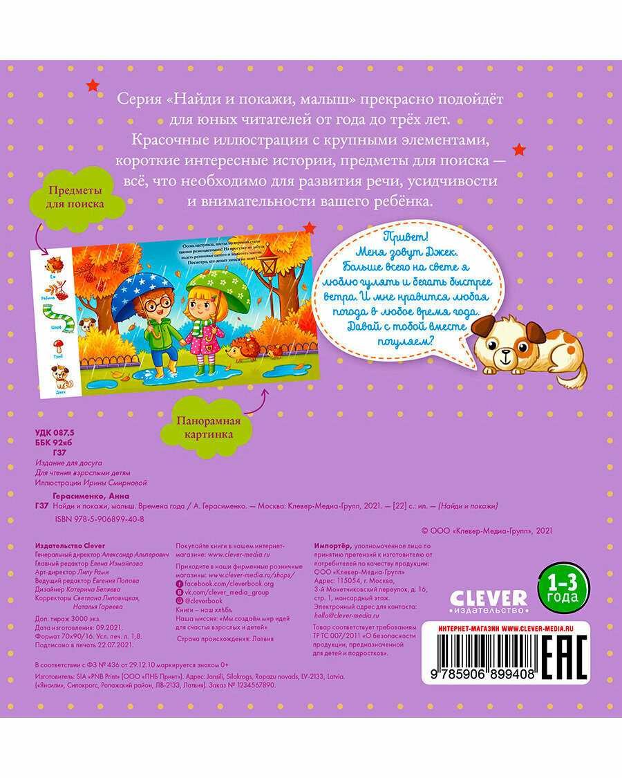 Сервис сравнения цен СкидкаГИД предлагает сравнить цены на товар «Книга: Найди и покажи малыш. Времена года (Герасименко); Clever, 2017»