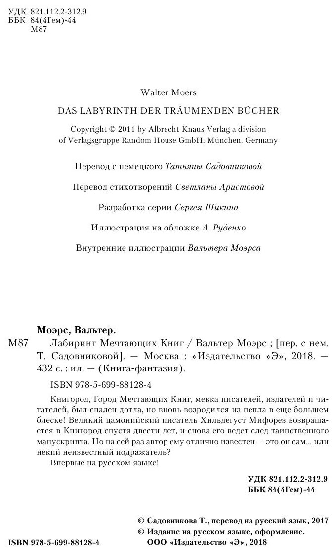 Сервис сравнения цен СкидкаГИД предлагает сравнить цены на товар «Книга: Лабиринт Мечтающих Книг (Садовникова Т.В. (переводчик), Моэрс Вальтер , Моэрс Вальтер (иллюстратор)); Эксмо, 2017»