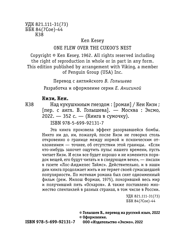 Книга: Над кукушкиным гнездом (кизи к.); Эксмо, 2017