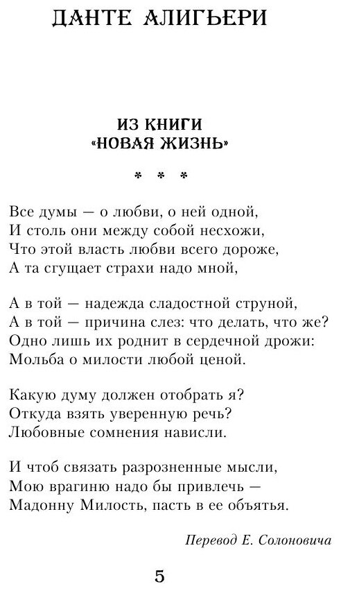 Любовь земная и любовь, возносящая человека к Небесам, прославлены в бессмертных творениях величайших мастеров сонета - Данте, Петрарки, Пьера де Ронсара, Эдмунда Спенсера, Уильяма Шекспира. Образы Беатриче, Лауры, Елены, "Смуглой Леди" пленяют по сей день.