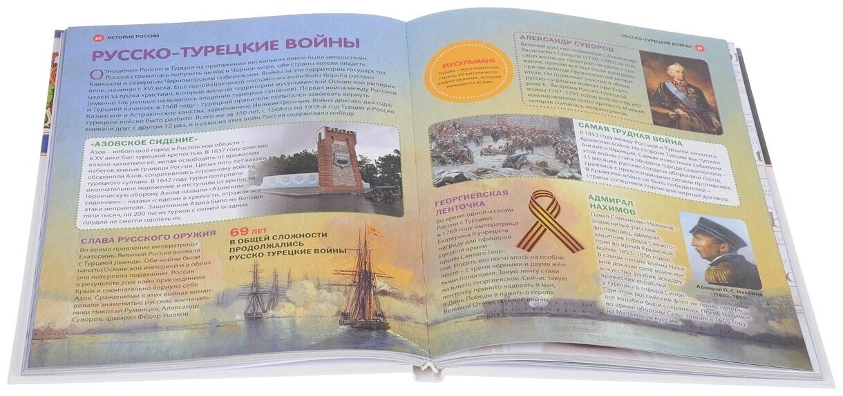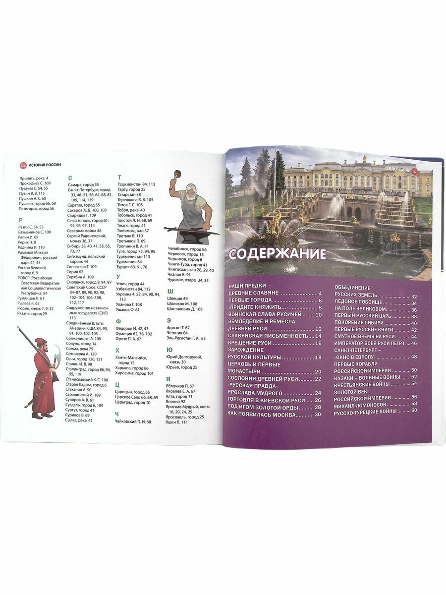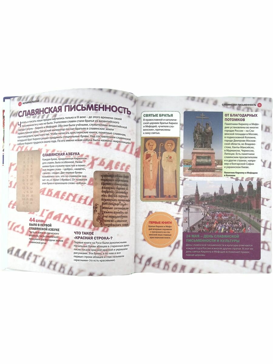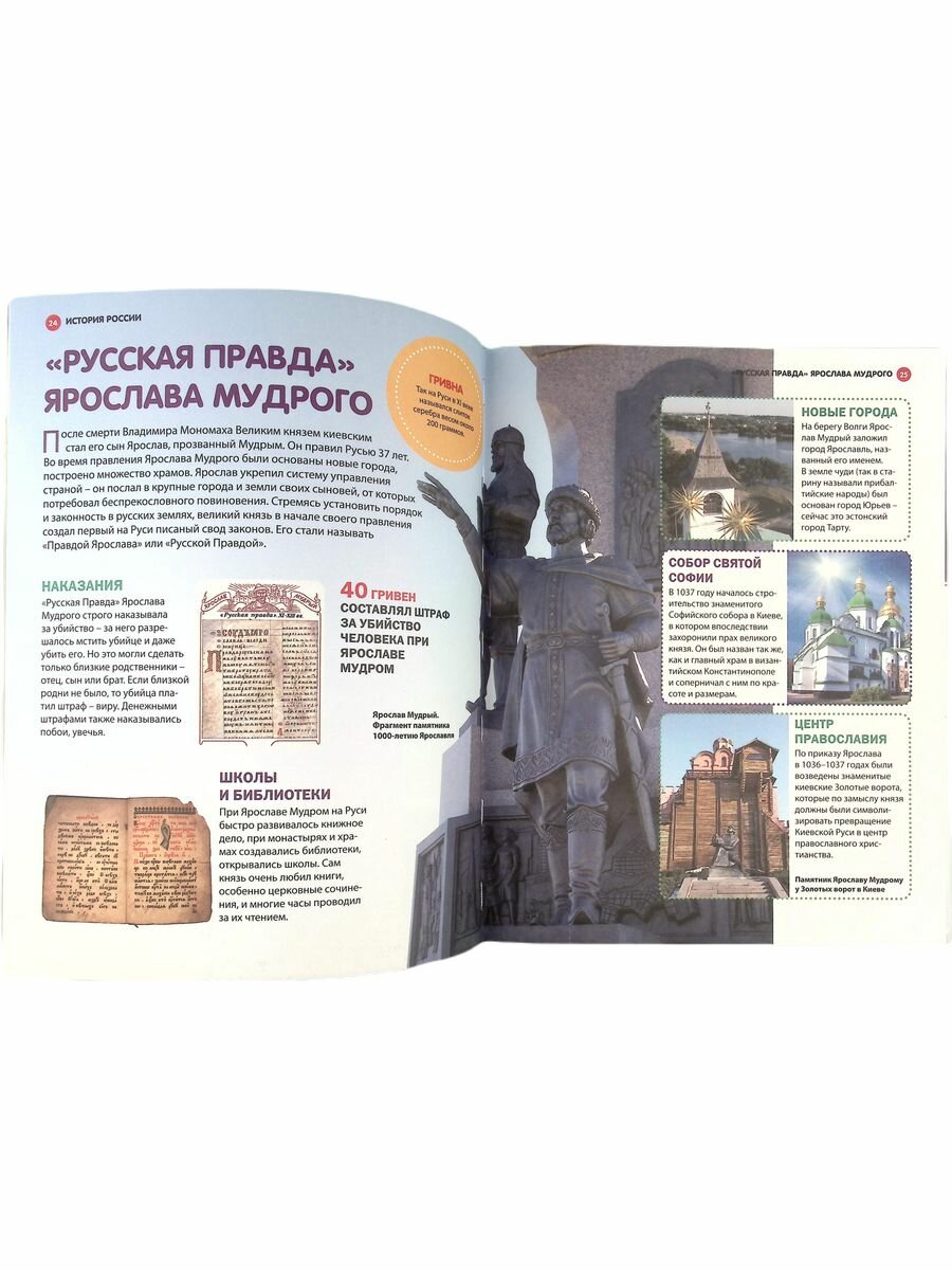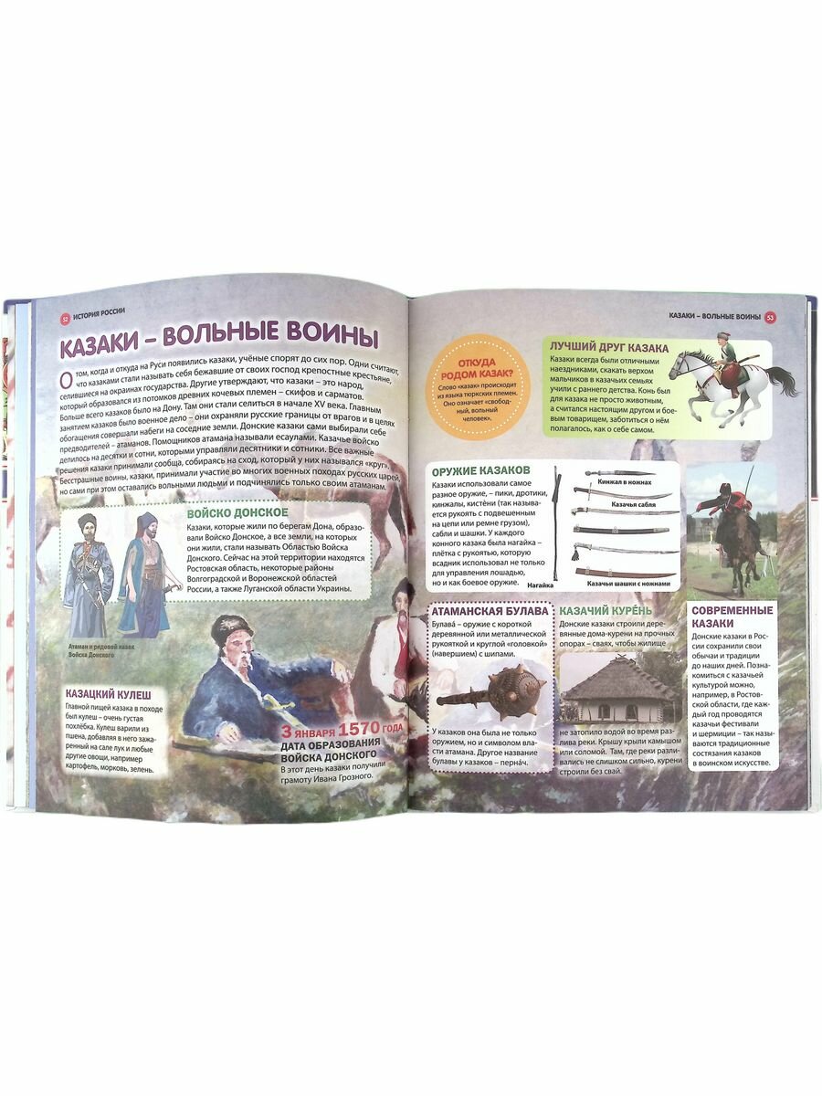 В первую очередь мне в этой энциклопедии понравился объем охватывающих тем: от первых народностей на территории Руси до современной России. Конечно, для такого большого объема понадобилось бы несколько томов книг, но здесь по каждой теме идет именно краткое и емкое описание, так, чтобы в общих чертах иметь представление. Поэтому смело рекомендую покупать эту энциклопедию именно для ребят младших классов. Для старших деток информация, как мне кажется, должна быть глубже. Но это лично мое мнение.