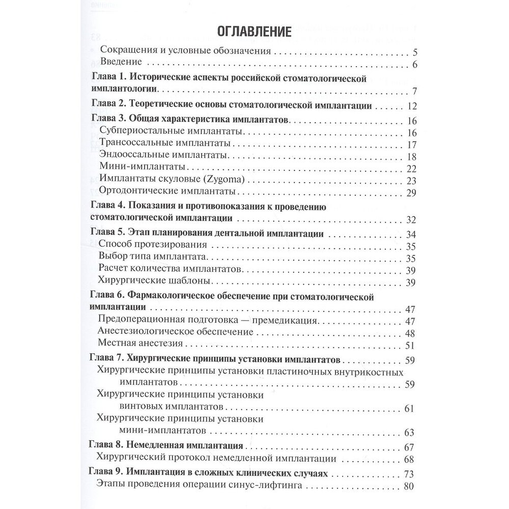 Приведена общая характеристика систем имплантатов, рассмотрены показания и противопоказания к проведению дентальной имплантации, этапы планирования ортопедического лечения с использованием дентальных имплантатов, описано фармакологическое сопровождение операций, изложены хирургические принципы установки имплантатов и протокол наблюдения за пациентами, методы, средства профилактики и гигиены.