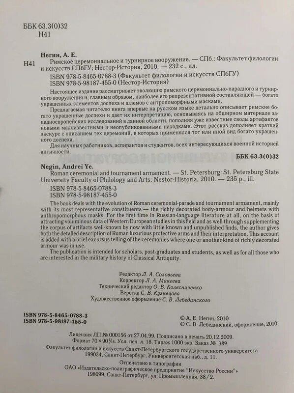 Римское церемониальное турнирное вооружение (Негин Андрей); Нестор-История, Факультет филологии и искусств Санкт-Петербургского государственного университета, 2010