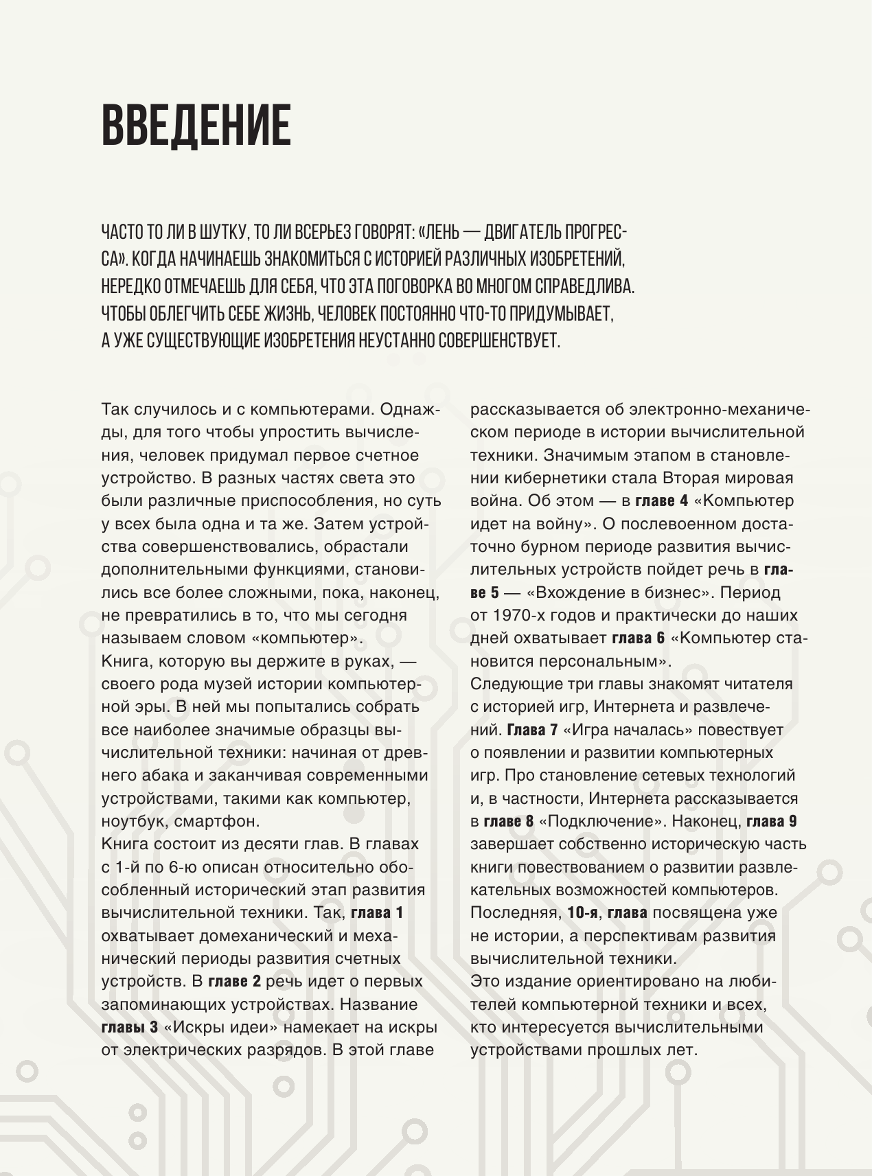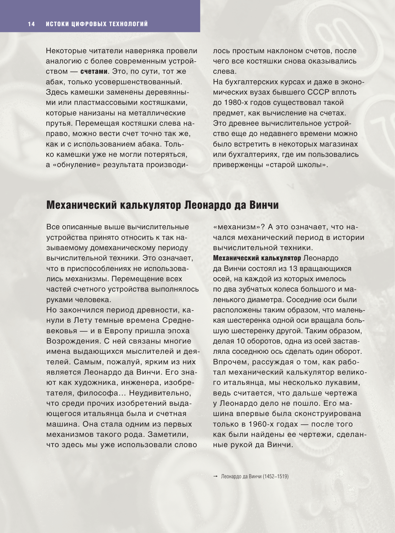 Вы знаете, когда возникли первые счетные устройства? Что они собой представляли? Какие приспособления для математических вычислений использовали в XIX веке? Кто был первым программистом? Если нет, то добро пожаловать в мир истории компьютерной эры. Эта книга познакомит вас не только с устройствами, которые использовал человек в разные времена для вычислений, но и с людьми, которые двигали вперед науку и технику. На страницах книги вы найдете устройства от абака до смартфонов, от машины Бэббиджа до суперкомпьютера Deep Blue. Познакомитесь с личностями от Леонардо да Винчи до Джона фон Неймана и Стива Джобса. Узнаете об этапах развития вычислительных устройств начиная с домеханического периода до компьютеров последнего поколения.