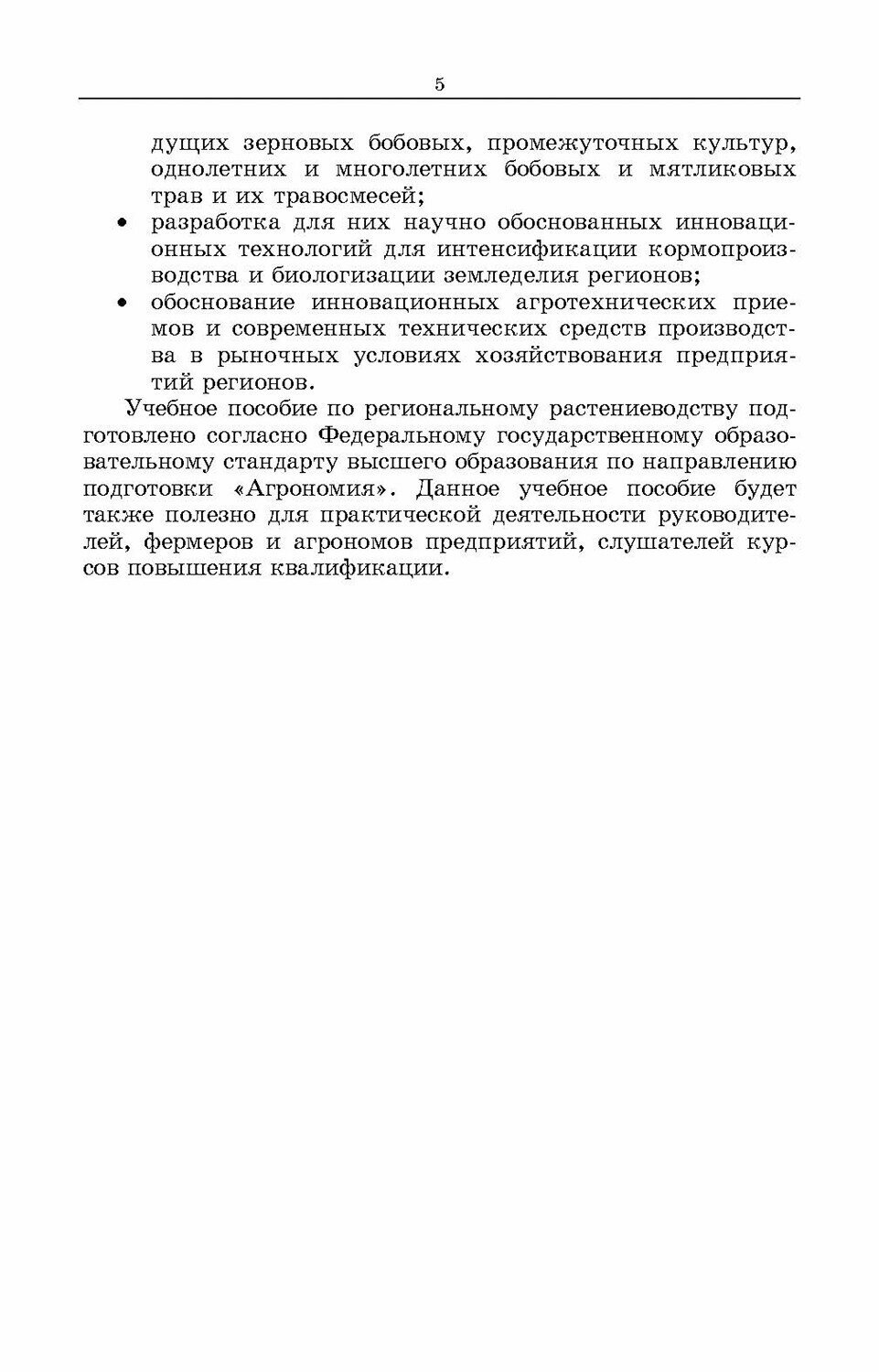 В учебном пособии дается понятие регионального растениеводства и его значения для современного сельскохозяйственного производства регионов европейской части Российской Федерации. Рассмотрены также цели и задачи регионального растениеводства и способы их решения в условиях биологической интенсификации земледелия регионов. Представлены подробные сведения о возделывании в регионах России основных зерновых бобовых, промежуточных культур, однолетних и многолетних трав, пищевых и кормовых свойствах с учетом содержания основных питательных веществ и химического состава, обоснованы границы возможного их распространения с учетом почвенно-климатических ресурсов природно-сельскохозяйственных поясов, провинций и округов возделывания. Изложены морфологические и биологические особенности, научные основы агротехнологий, признанные решать проблемы дефицита растительного белка и повышения плодородия почвы. Изучив их, студенты и магистры с помощью агротехнических и биологических приемов, рациональных методов и средств производства с учетом почвенно-климатических условий регионов смогут самостоятельно разрабатывать инновационные базовые технологии зерновых бобовых, промежуточных культур, однолетних и многолетних трав для регионов в вузах которых они обучаются. Издание предназначено для бакалавров обучающихся по направлению "Агрохимия и агропочвоведение", "Агрономия", "Технология производства и переработки сельскохозяйственной продукции", а также для преподавателей, научных сотрудников, аспирантов, магистрантов, слушателей факультетов повышения квалификации, работников агропромышленного комплекса. Гриф: Рекомендовано НМС по сельскому хозяйству в качестве учебного пособия для студентов вузов (бакалавров), обучающихся по направлениям подготовки: "Агрохимия и агропочвоведение", "Агрономия", "Технология производства и переработки сельскохозяйственной продукции"